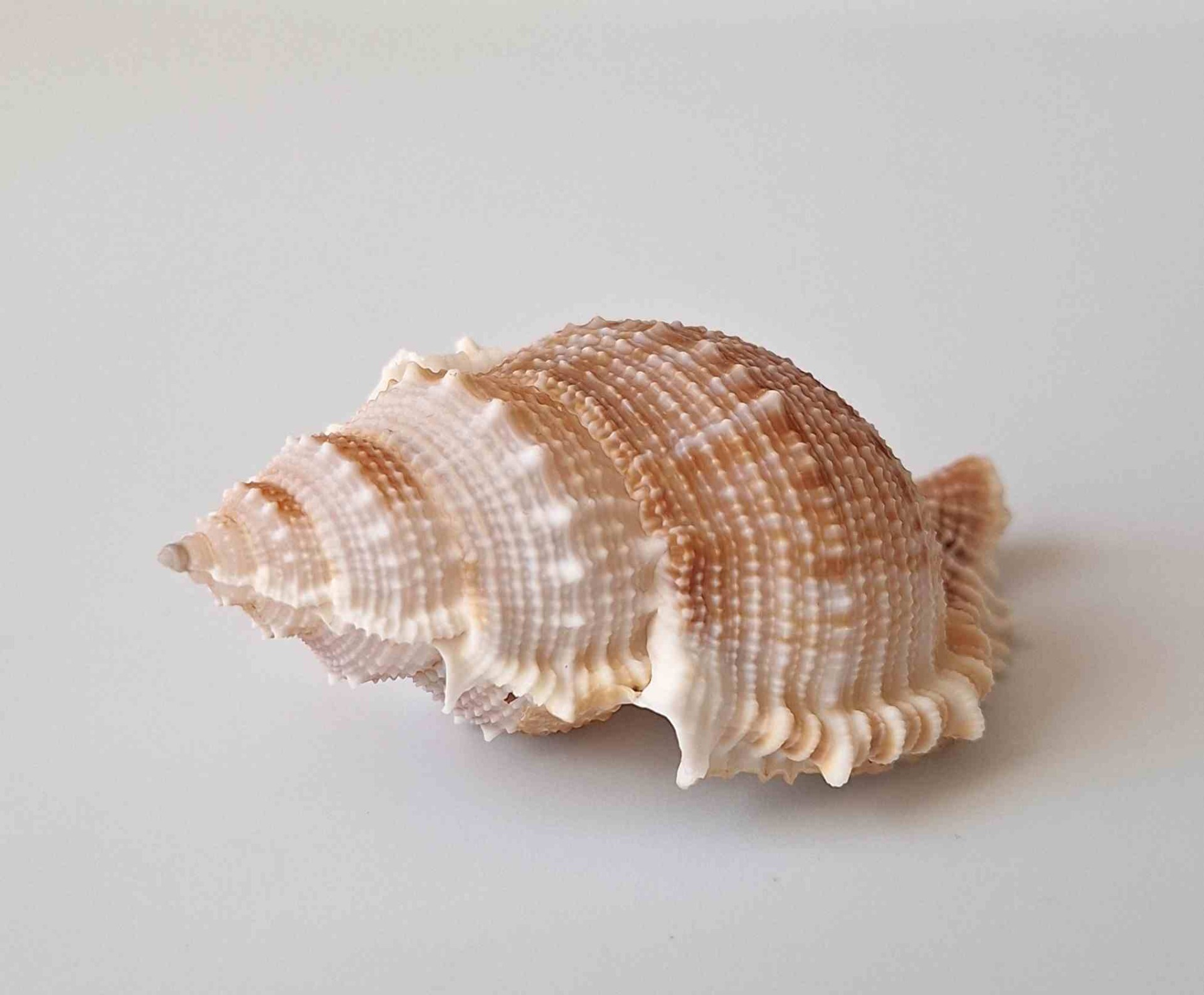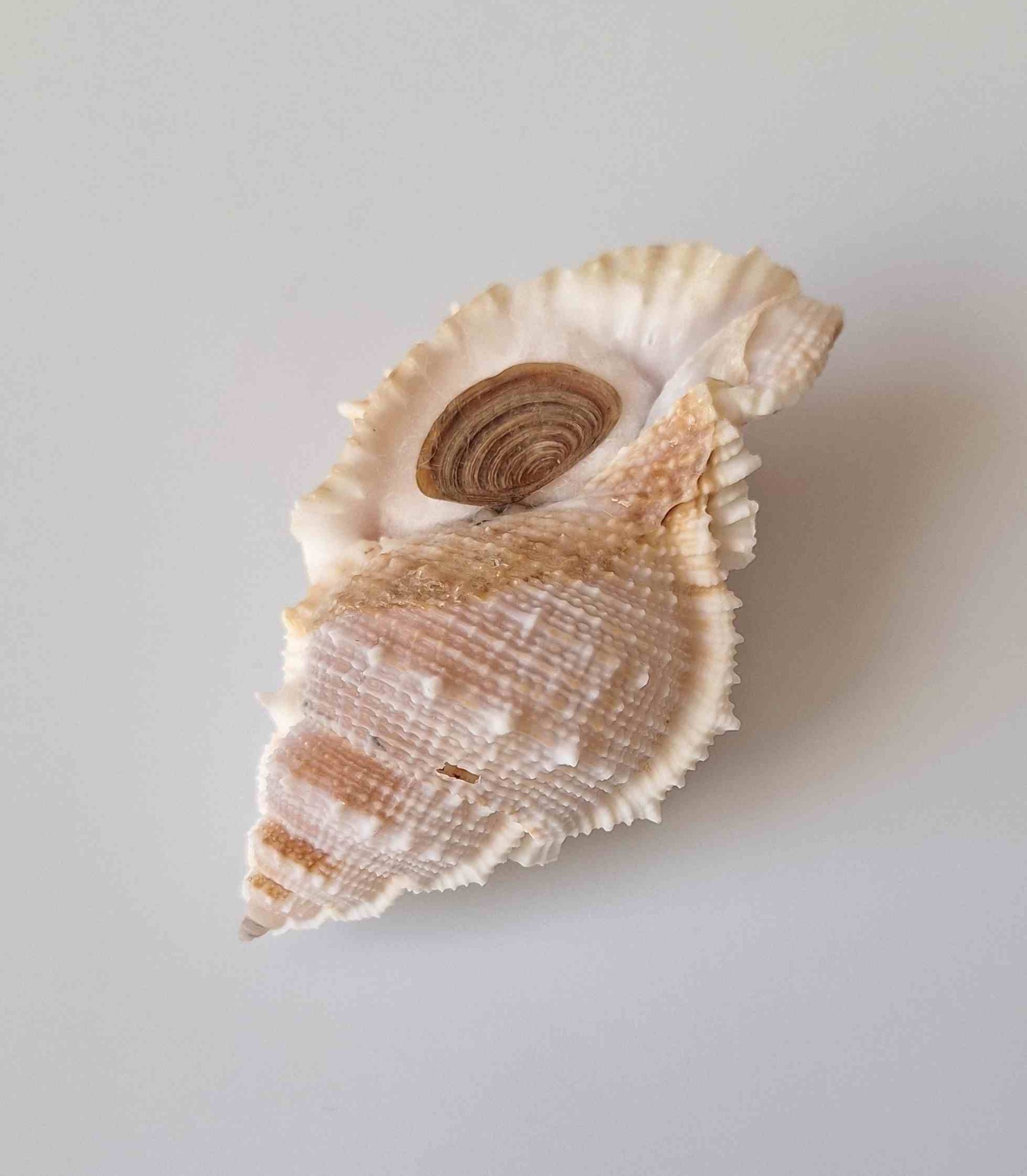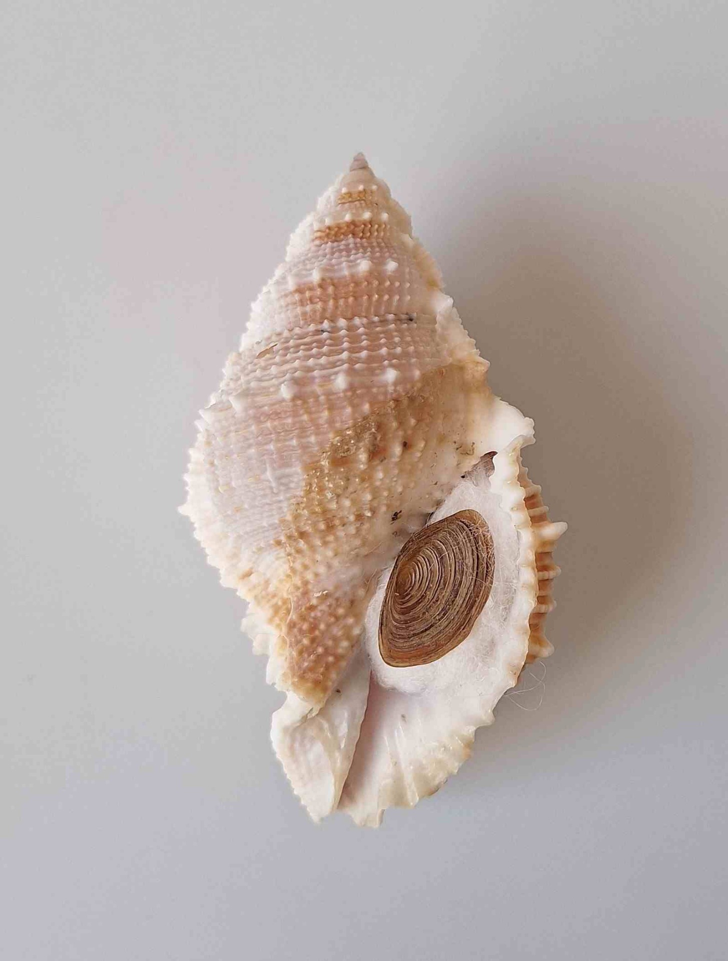 • moc hezky barevný kus s víčkem, ale bohužel má na spodní straně dvě dírky - větší dírka měří 3 mm, vyloven vlečnou sítí v hloubce 80 až 100 metrů (nice colored piece with operculum, but two holes on base - bigger hole is 3 mm in size, trawled at 80 to 100 meters)