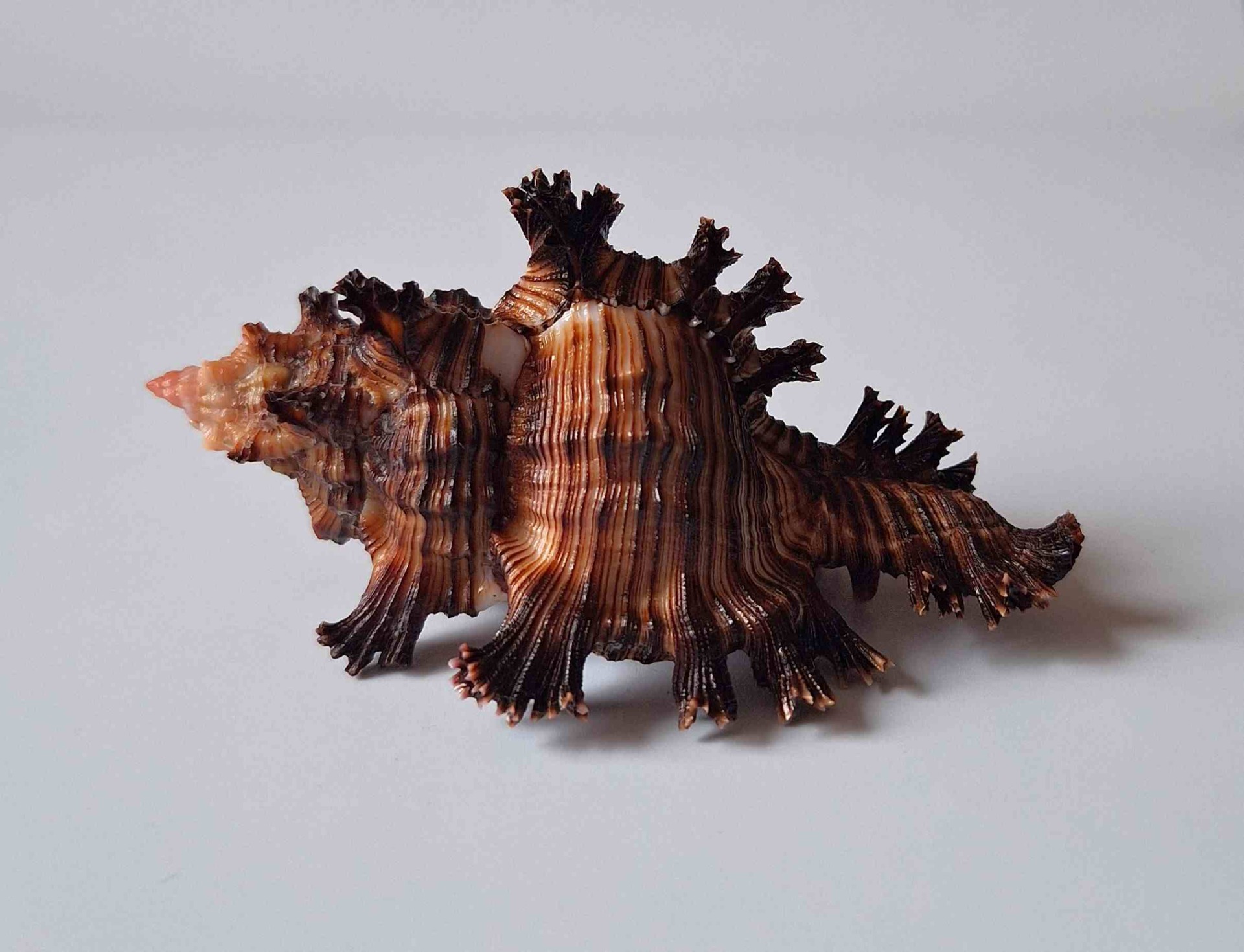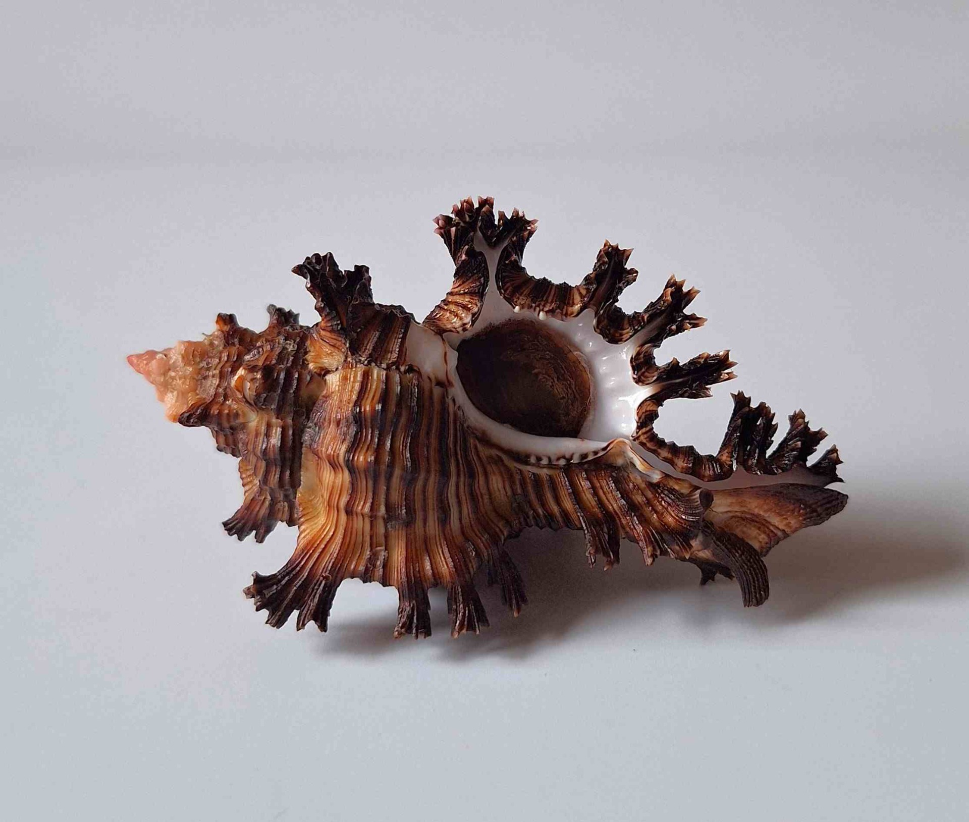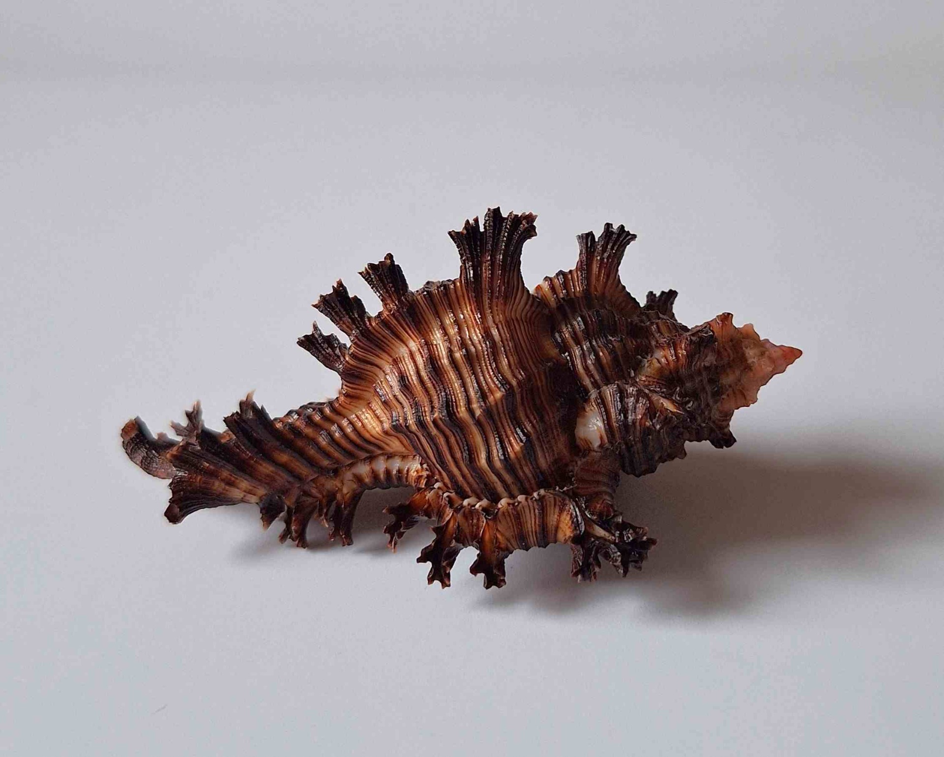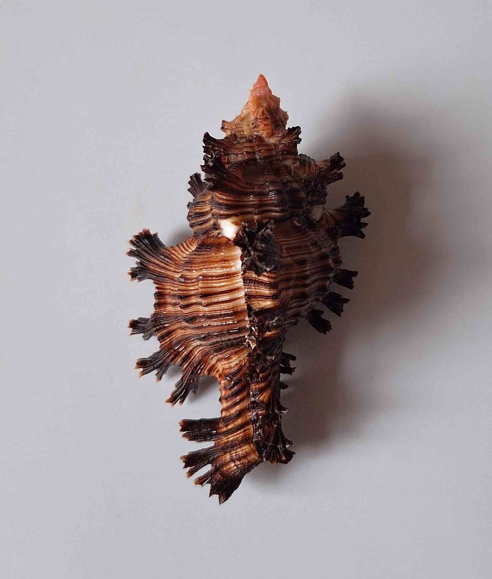 • nádherně vybarvený exemplář s víčkem, krásná tmavá barva, růžová špička, krásné trny, drobné nedokonalosti, vyloven vlečnou sítí v hloubce 200 metrů (beautiful colored specimen with operculum, the best dark color, pink apex, very nice thorns, minor imperfections, trawled at 200 meters deep)