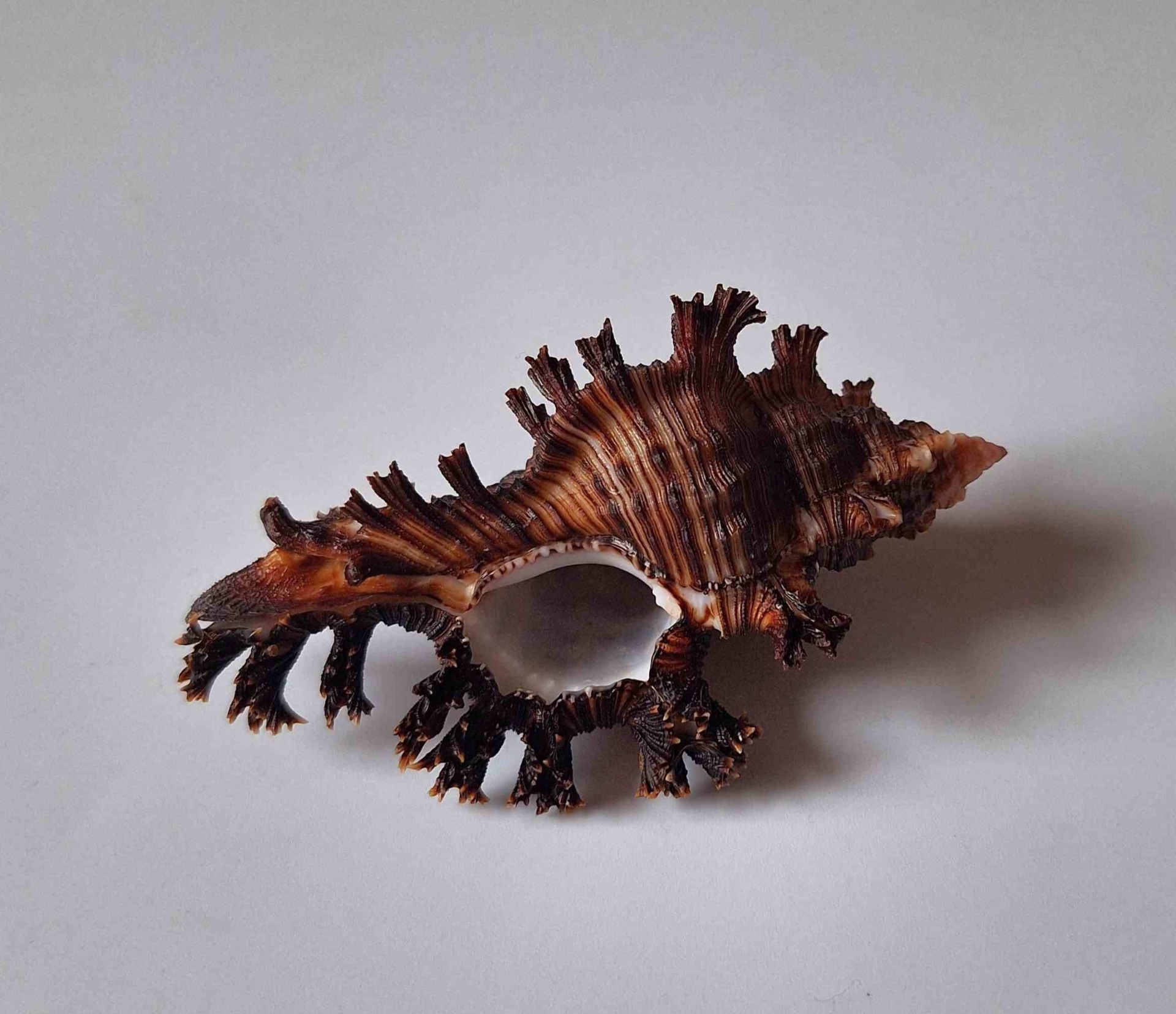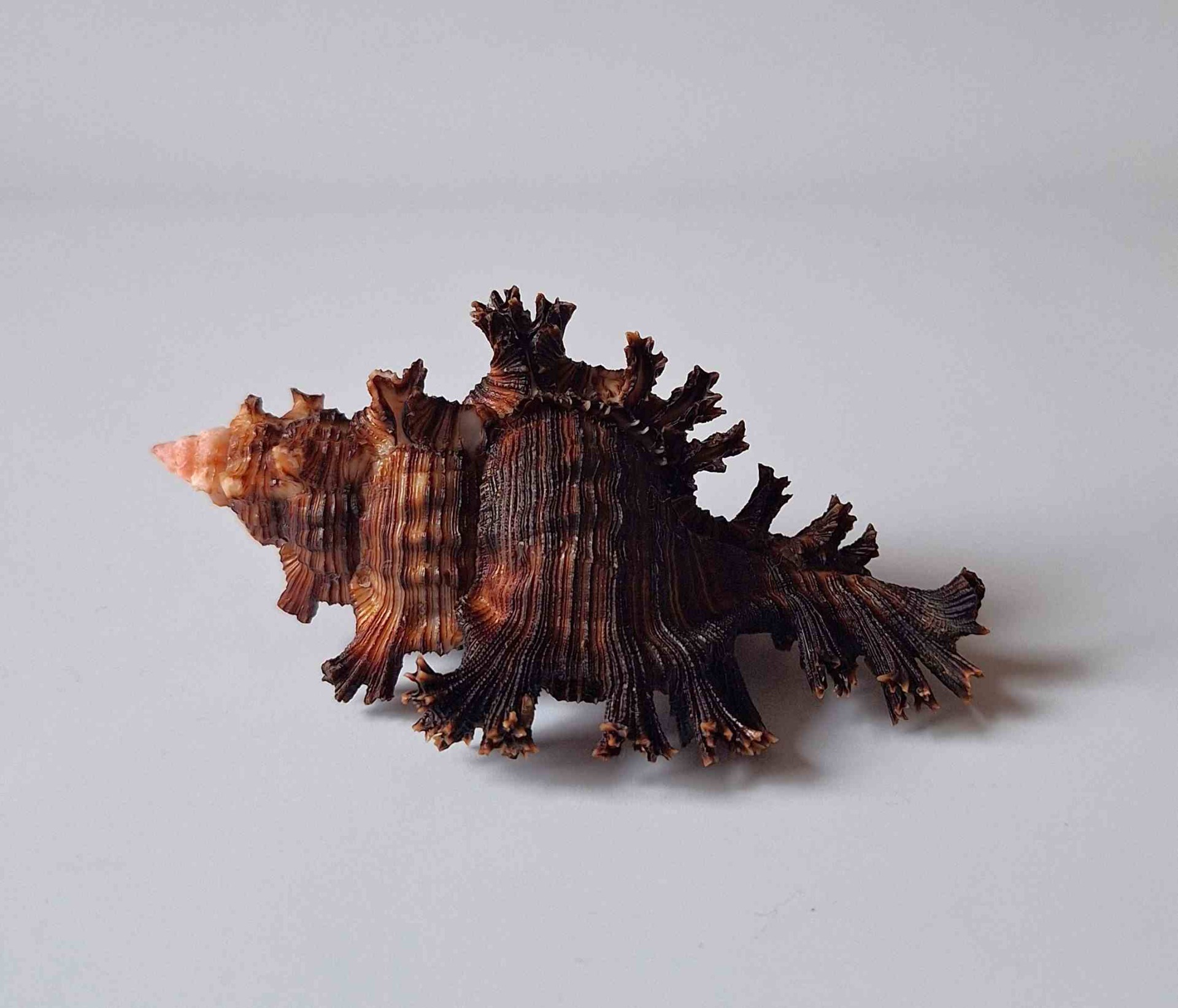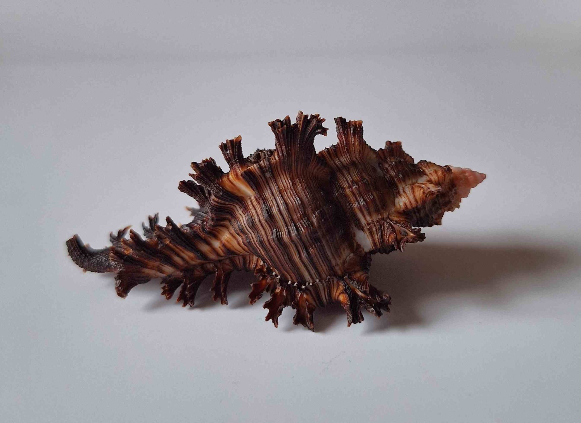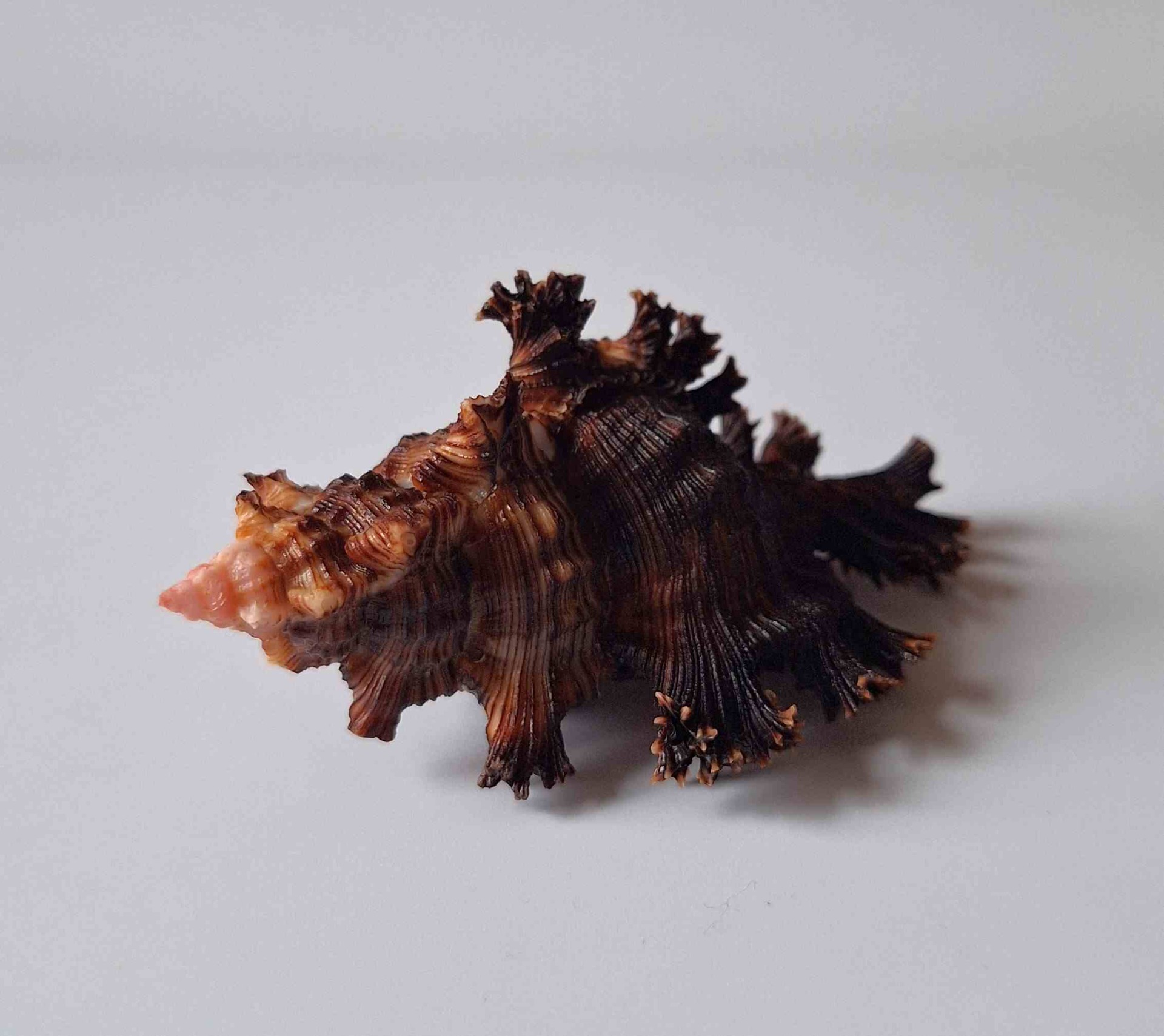 • velký nádherně vybarvený exemplář, krásná tmavá barva, růžová špička, krásné trny, drobné nedokonalosti, vyloven vlečnou sítí v hloubce 200 metrů (big beautiful colored specimen, the best dark color, pink apex, very nice thorns, minor imperfections, trawled at 200 meters deep)