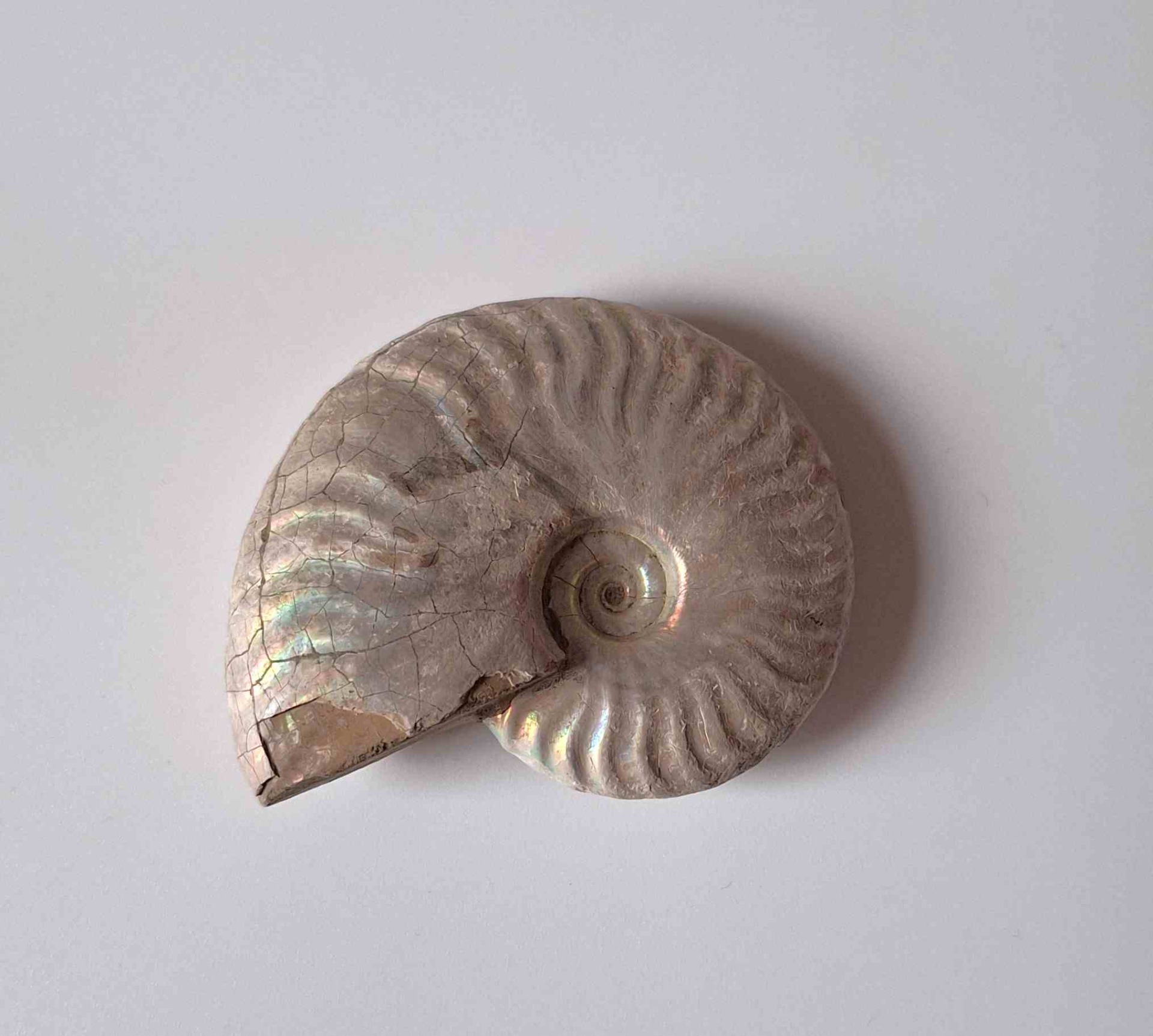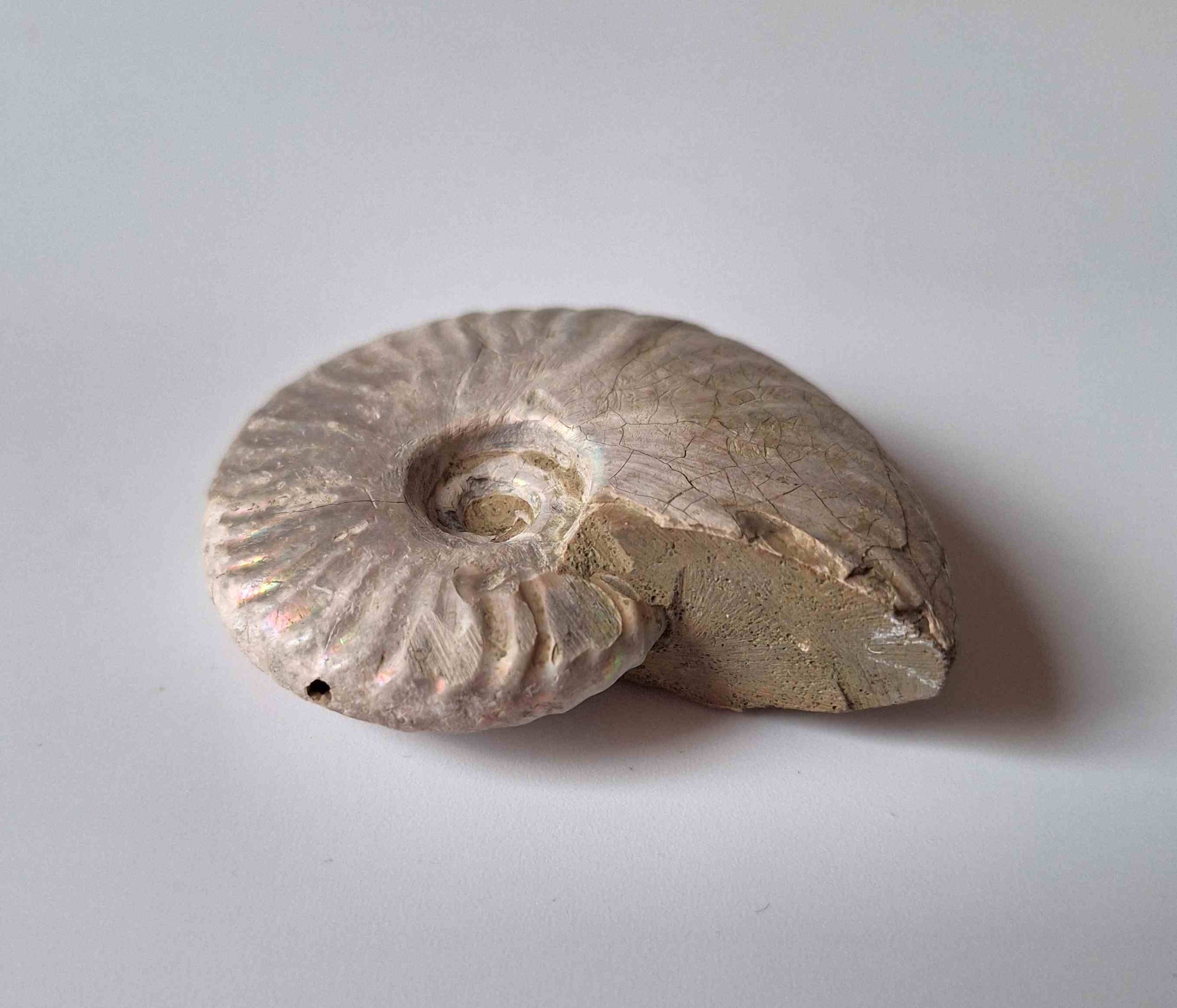 - leštěná zkamenělina celého amonita - krásně perleťový na povrchu, má dírku (polished whole ammonite fossil - beautiful pearlescent on the surface, one hole)