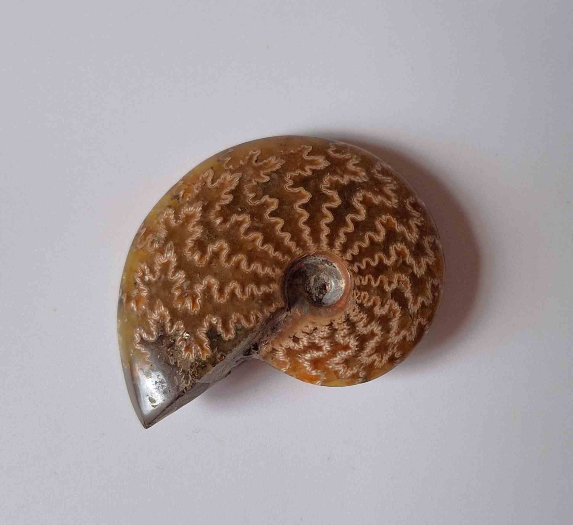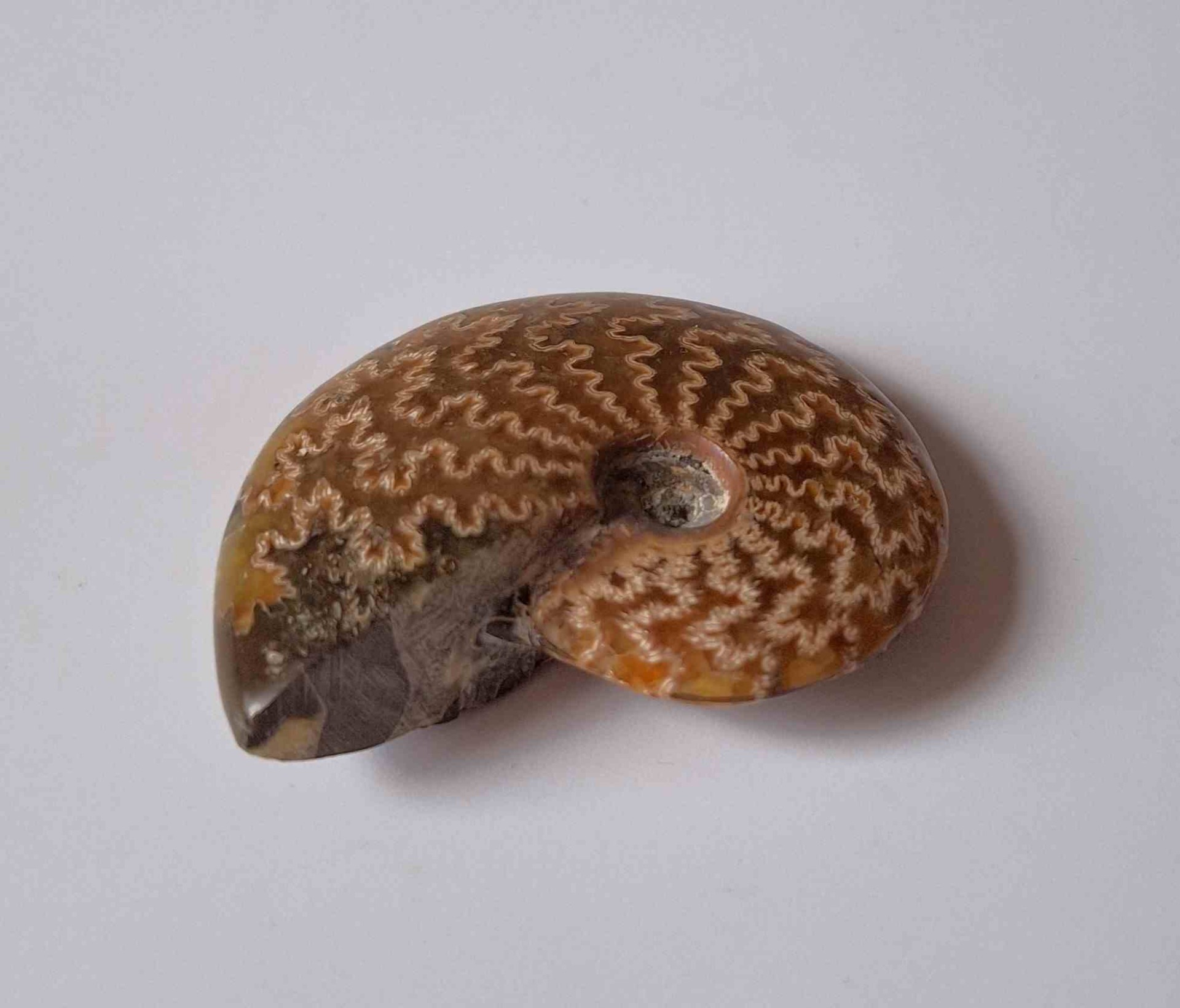 - leštěná zkamenělina celého amonita s krásným vzorem (polished whole ammonite fossil with beautiful pattern)