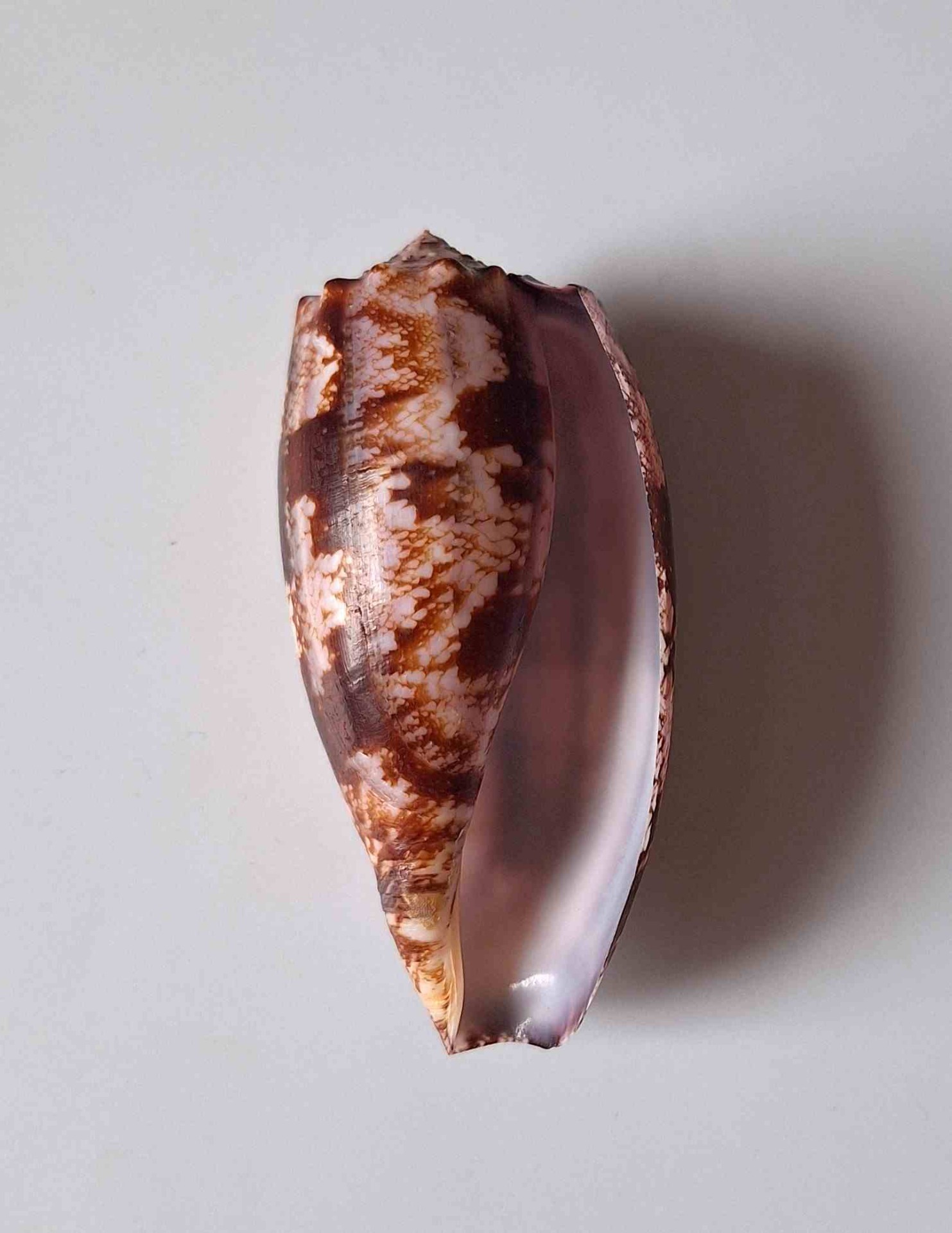 • velmi hezký exemplář, hnědo-fialová barva, růstové linie, vyloven v hloubce 15 až 25 metrů (very nice specimen, brownish-purple color, growth lines, taken by diving at a depth of 15 - 25 meters)