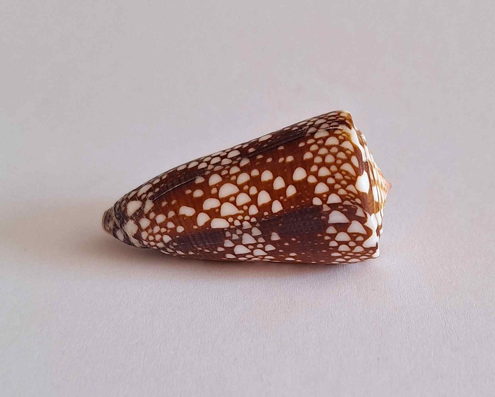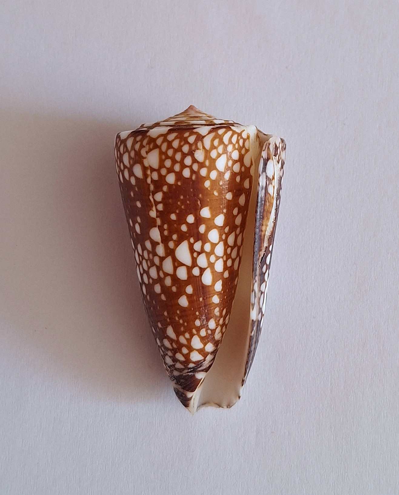 • barevný kus, hezký vzor a barva, rostoucí linie, jedna jizva, drobné štípnutí na okraji, vyloven v hloubce 20 metrů (colored piece, nice pattern and color, growth lines, one scar, minor chip on lip taken by diving at a depth of 5 to 20 meters)