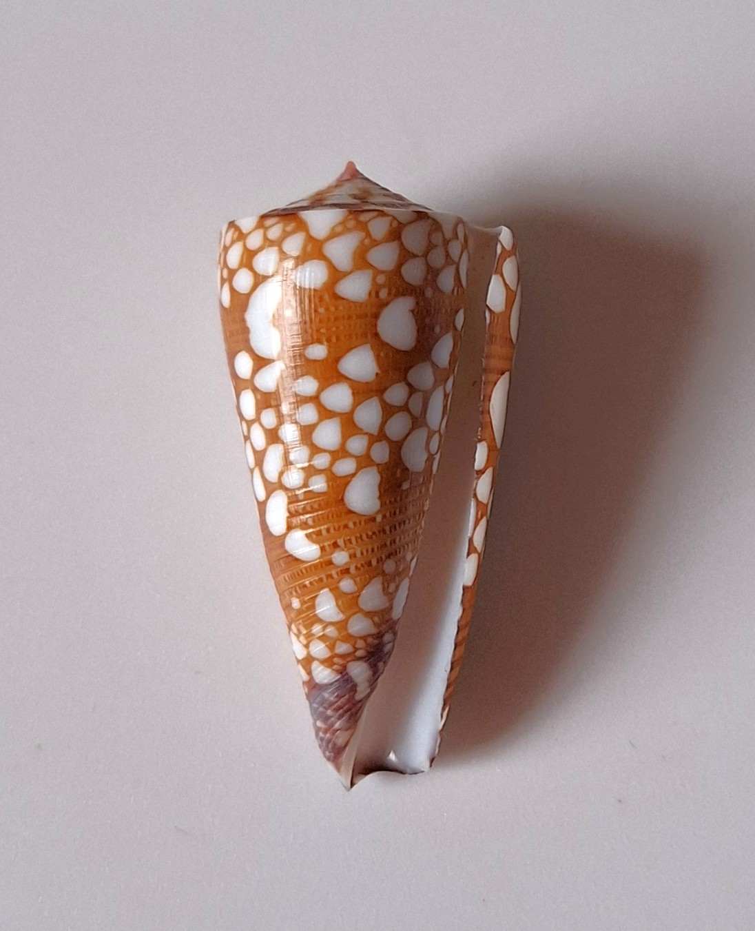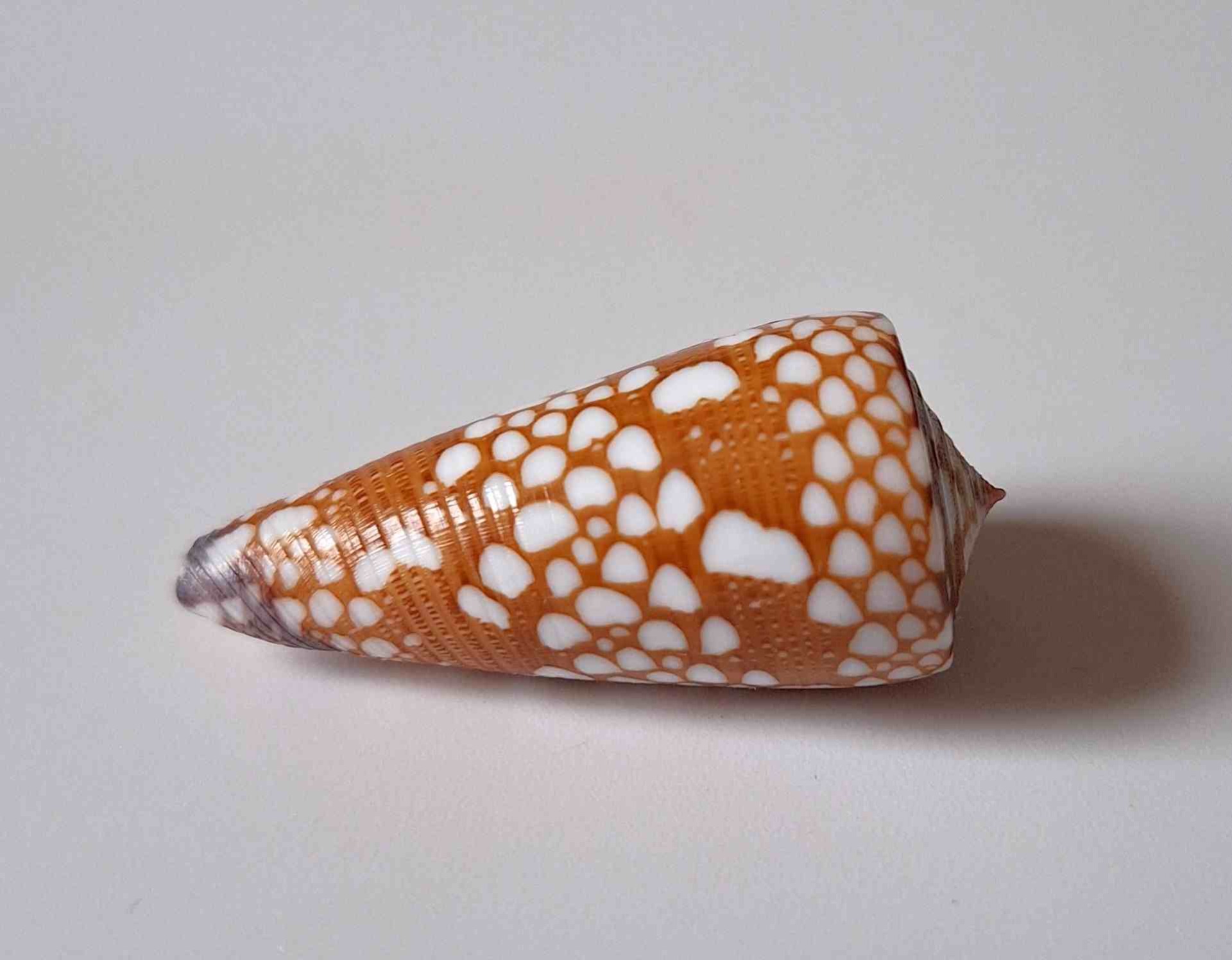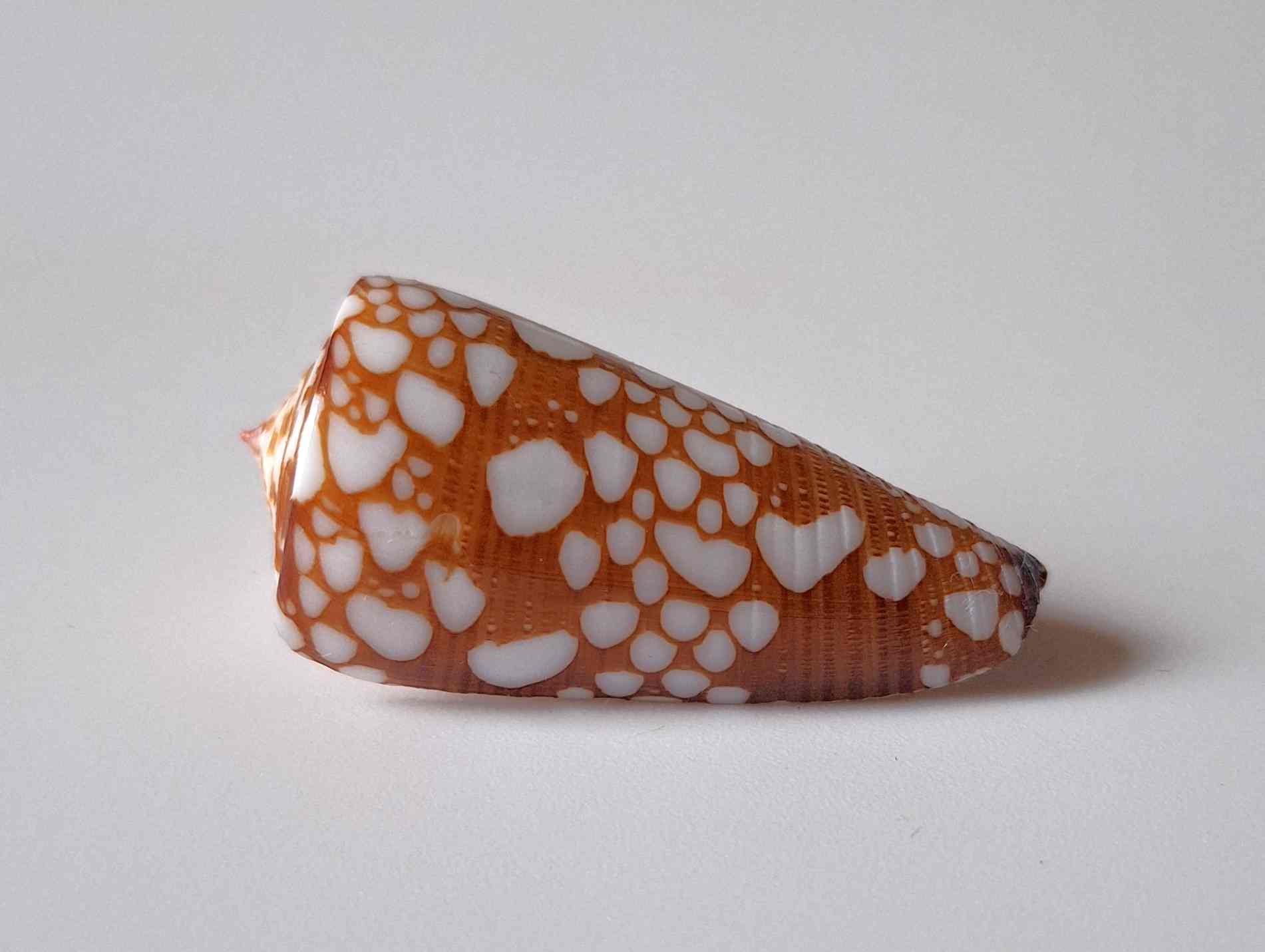 • krásný kus, hezká barva a vzor, štípnutí na okraji, z hloubky 20 metrů (beautiful piece, nice color and pattern, chip on lip, from depth of 20 meters)