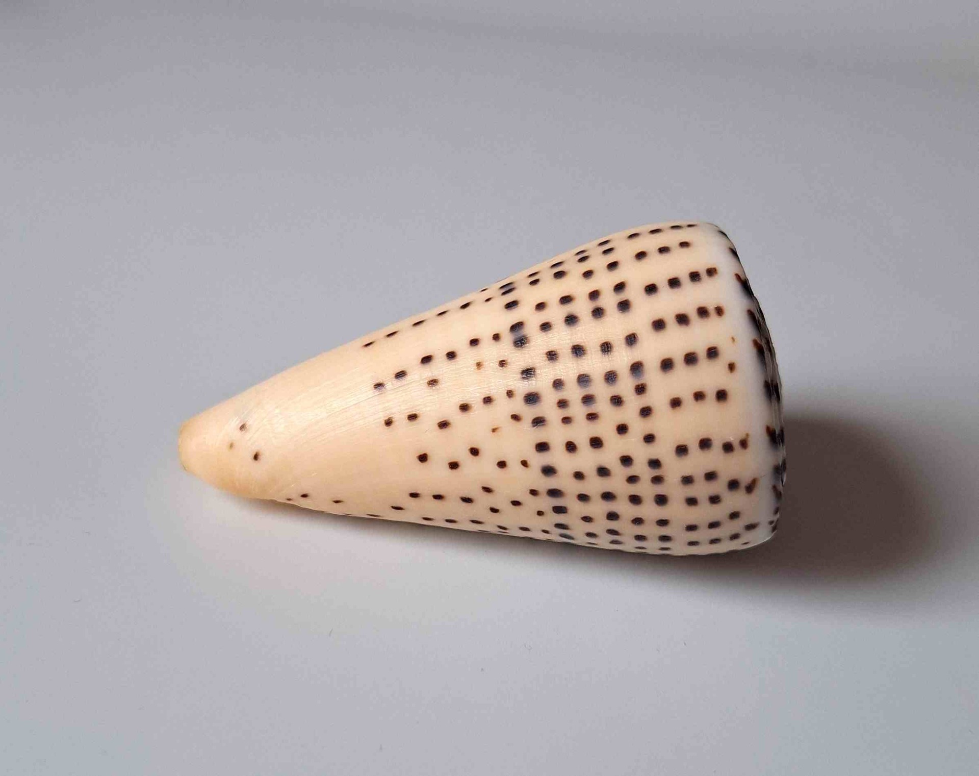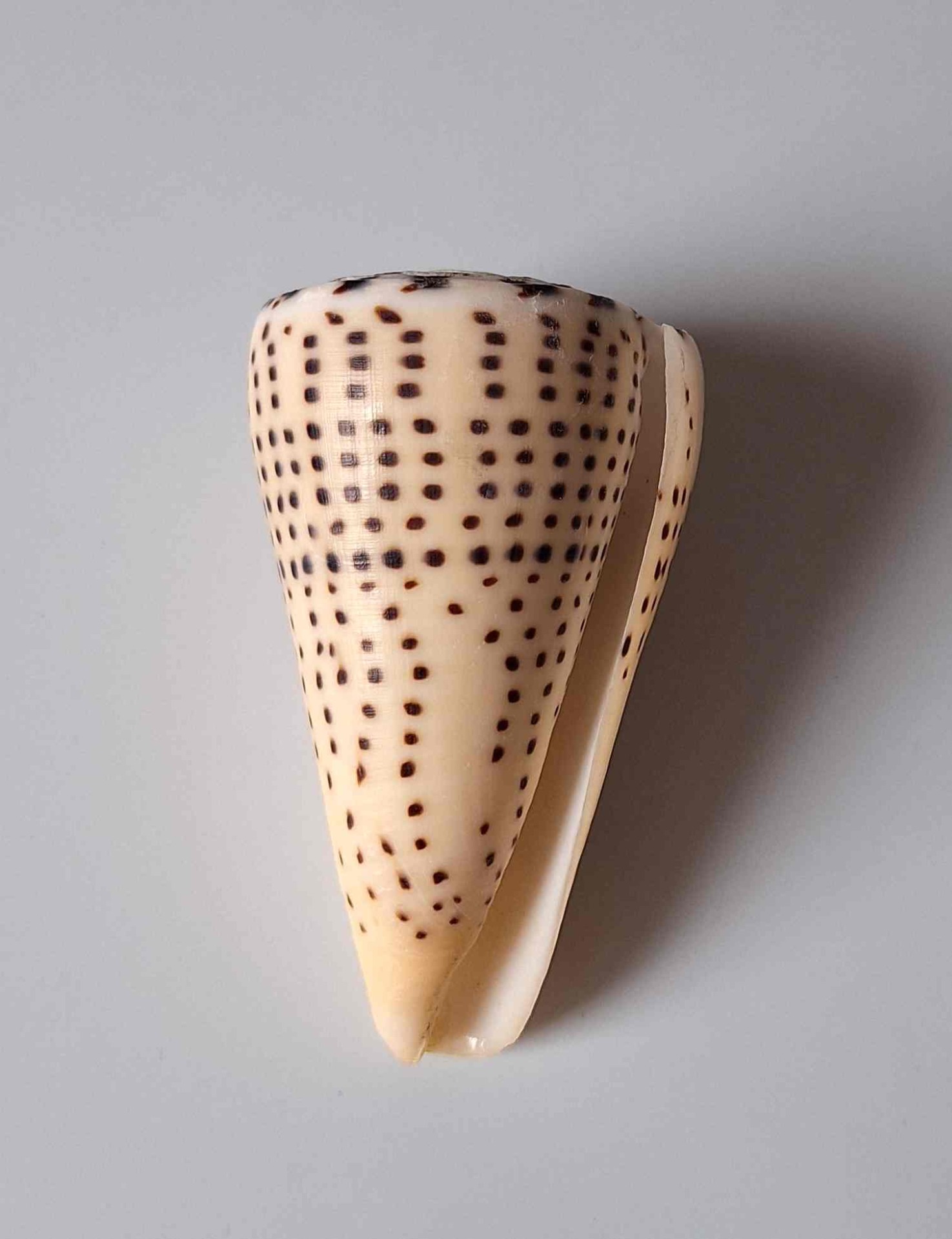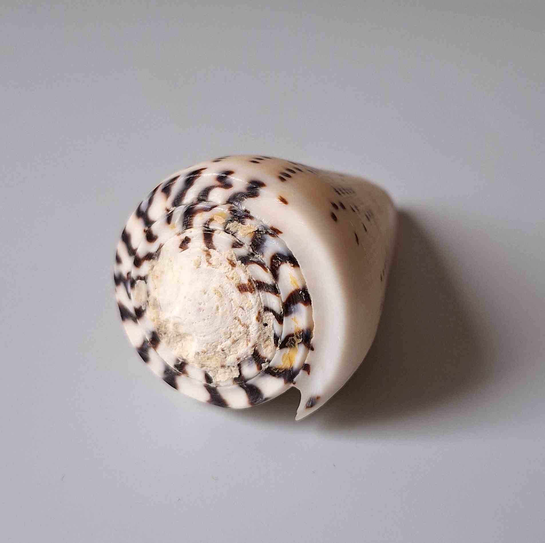 • hezký světlý kus, hezký vzor, špička poškozena, štípnutí na okraji, z hloubky 20 metrů (nice light piece, nice pattern, apex damage, chips on lip, from depth of 20 meters)