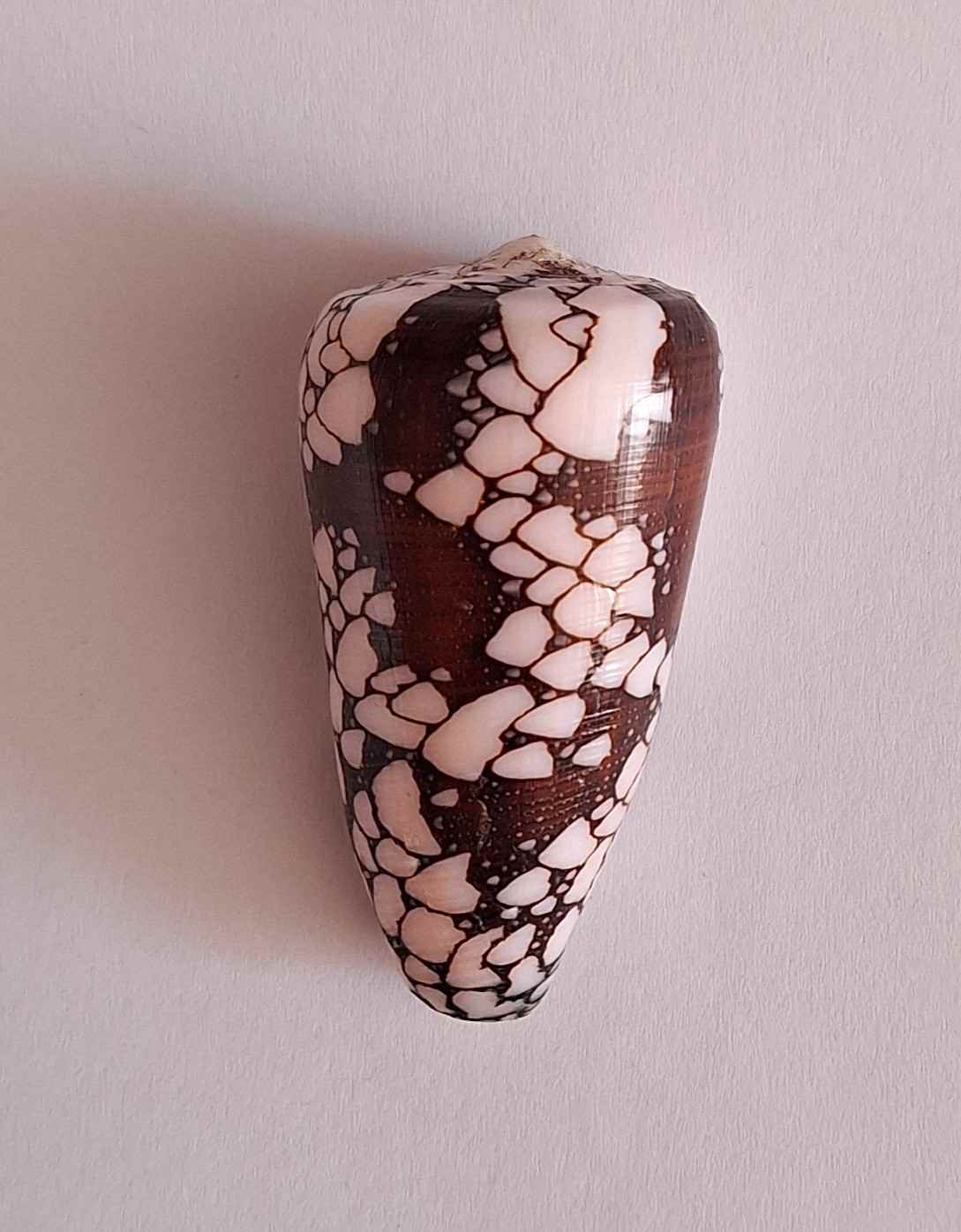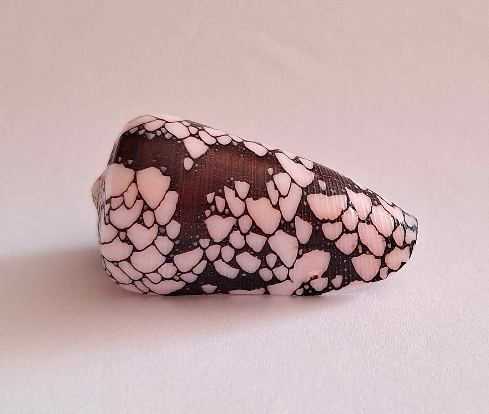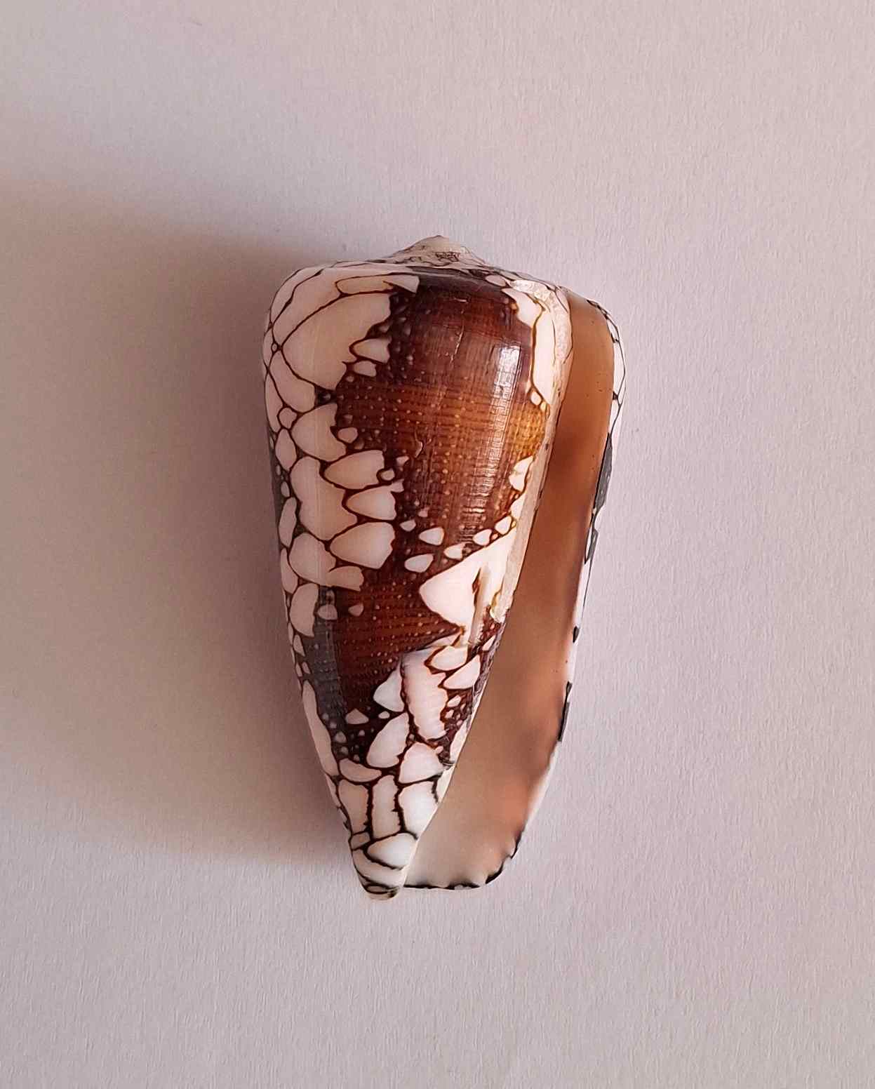 • nádherný vzácný kus, krásná barva a vzor, nádech do růžova, velká jizva u okraje, nově popsaný druh, vyloven v hloubce 20 metrů (beautiful rare piece, beautiful color and pattern, a hint of pink, lip lightly chipped, big scar near the lip, newly described species, taken by diving at a depth of 20 meters)