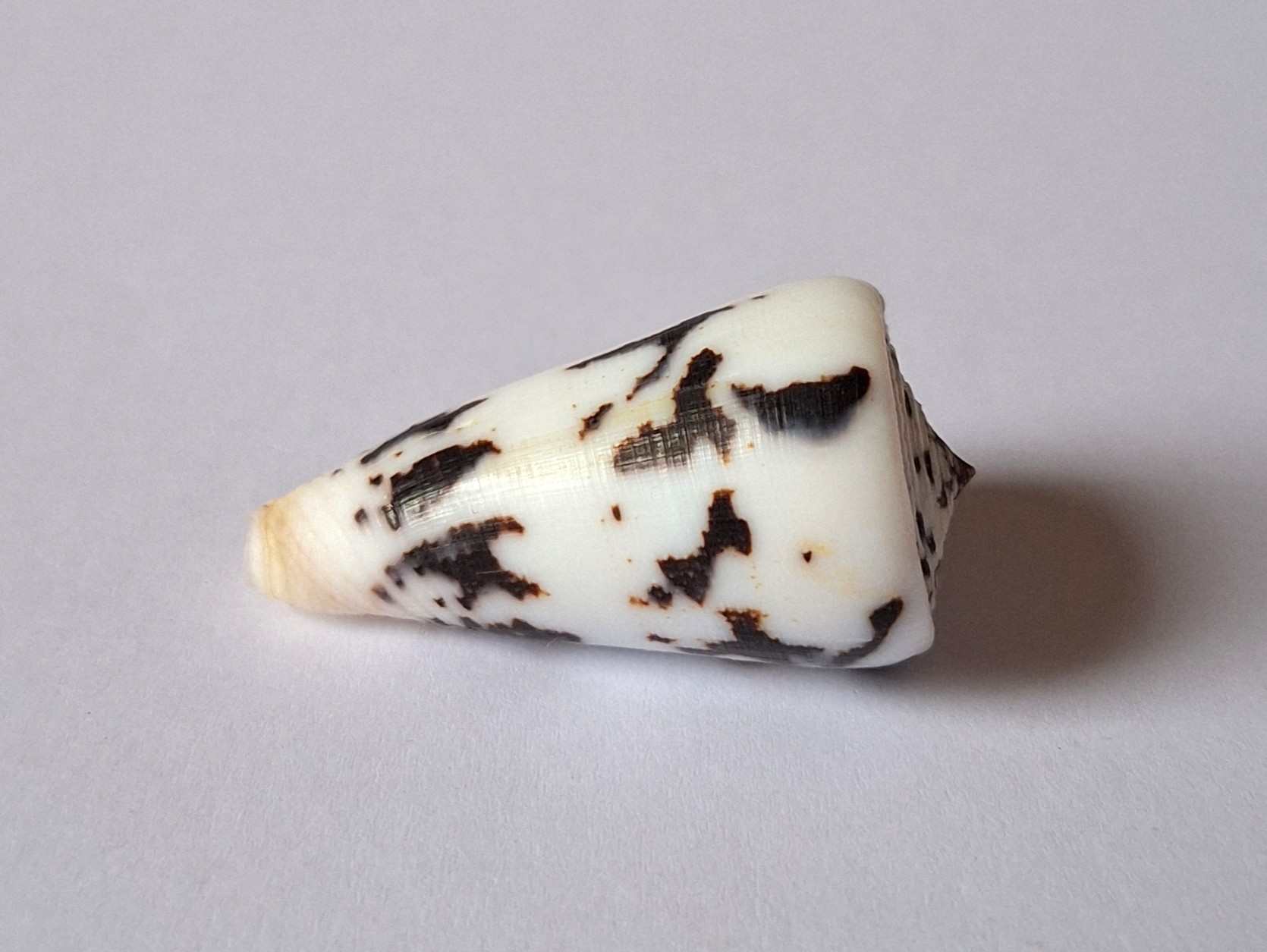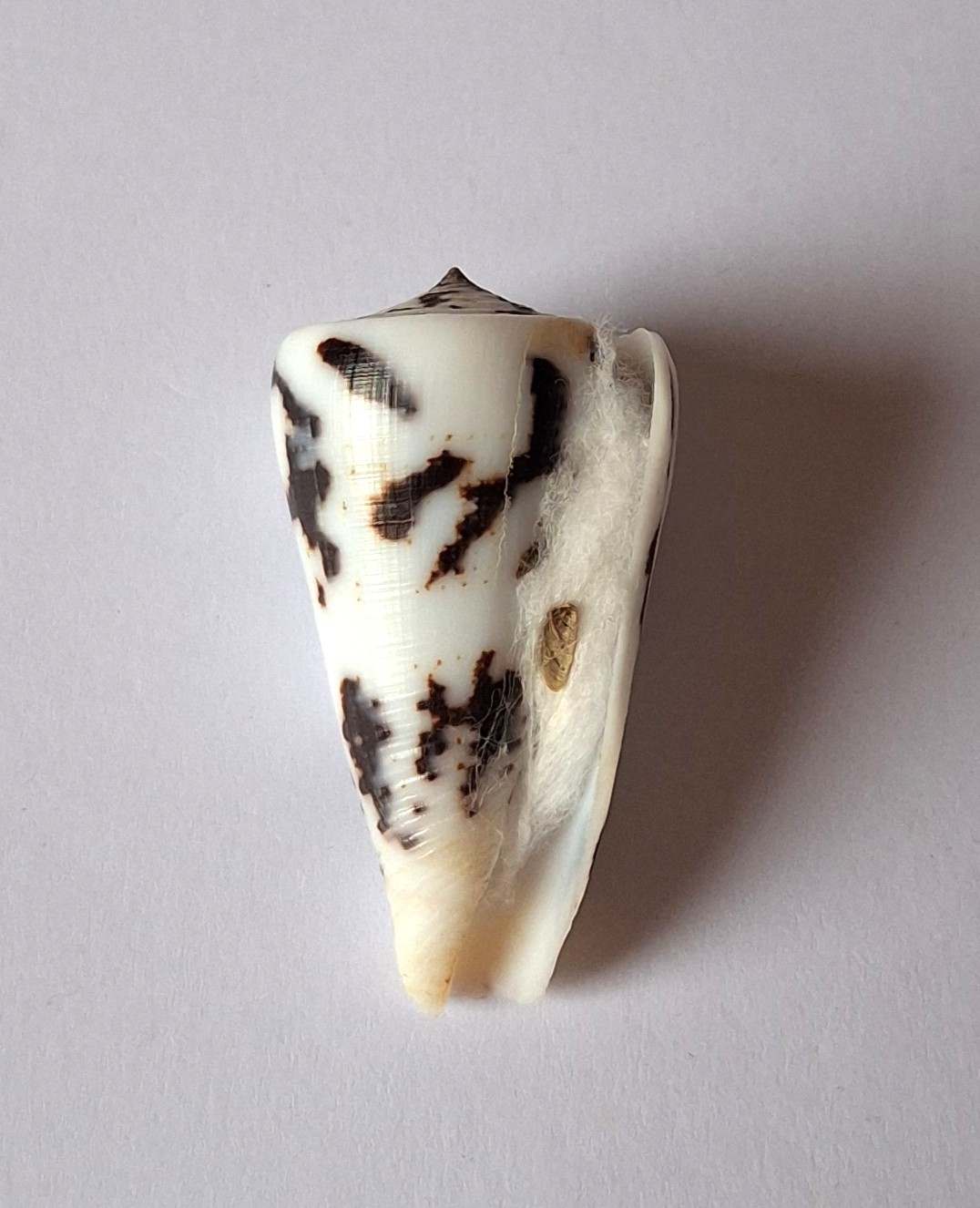 • hezký velký kus s víčkem, vzácný, bílá barva, hezký vzor, nepatrné štípnutí na okraji, štípnutý kanálek, vyloven v hloubce 5 až 20 metrů (nice big piece with operculum, rare, white color, nice pattern, minor chip on lip, chipped canal, taken by diving at a depth of 5 to 20 meters)