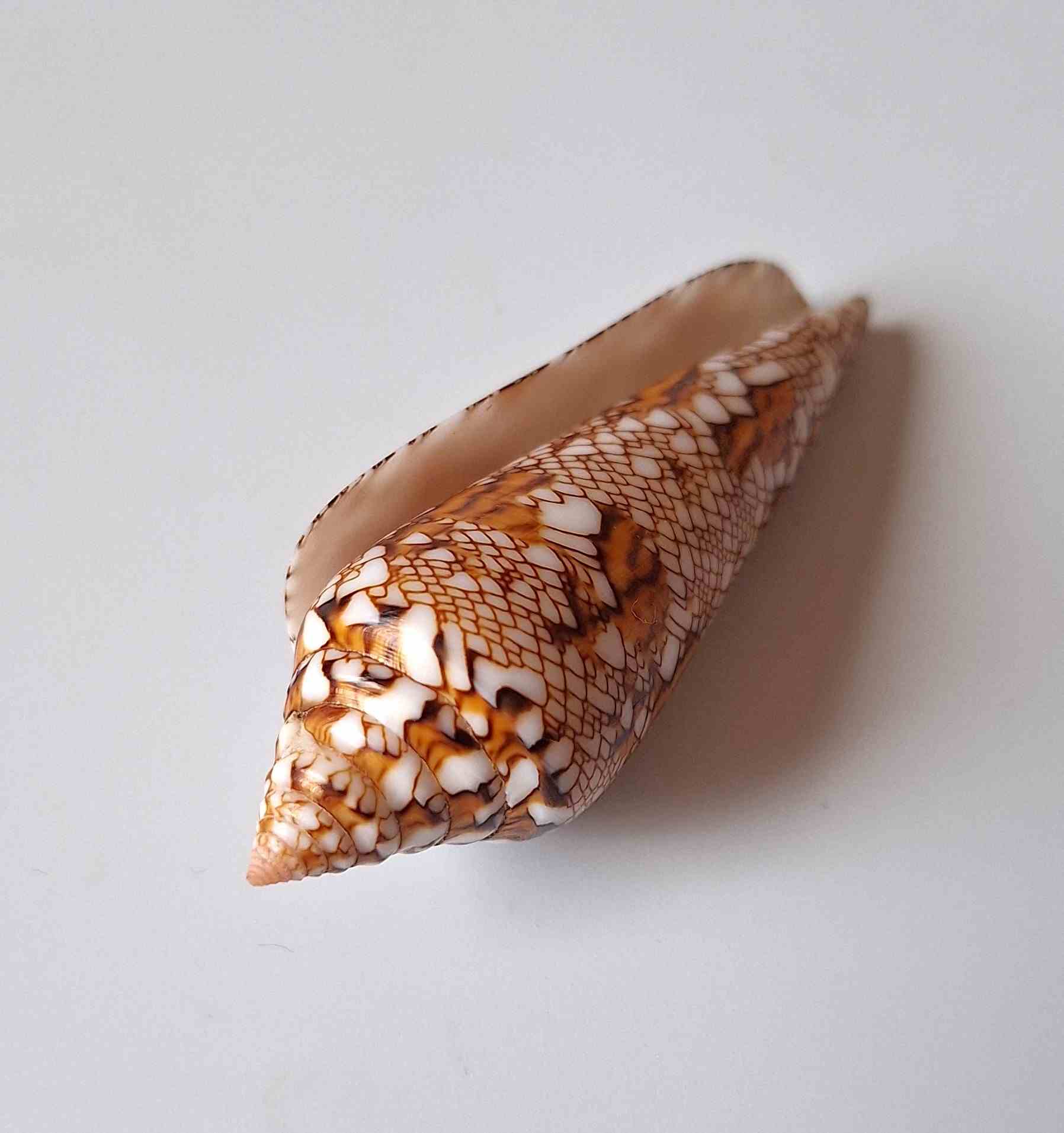 • nádherný vzácný exemplář, hezký vzor a barva, zhojená jizva na spodní straně v blízkosti špičky, vyloven v hloubce 5 až 20 metrů (beautiful rare specimen, very nice pattern and color and pattern, healed scar near apex, taken by diving at a depth of 5 to 20 meters)