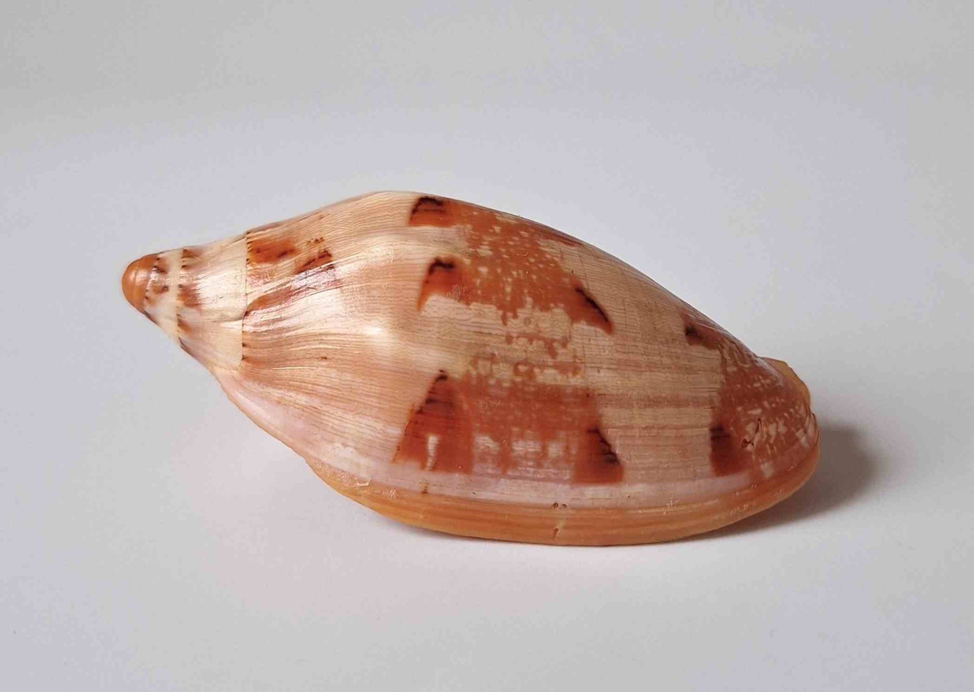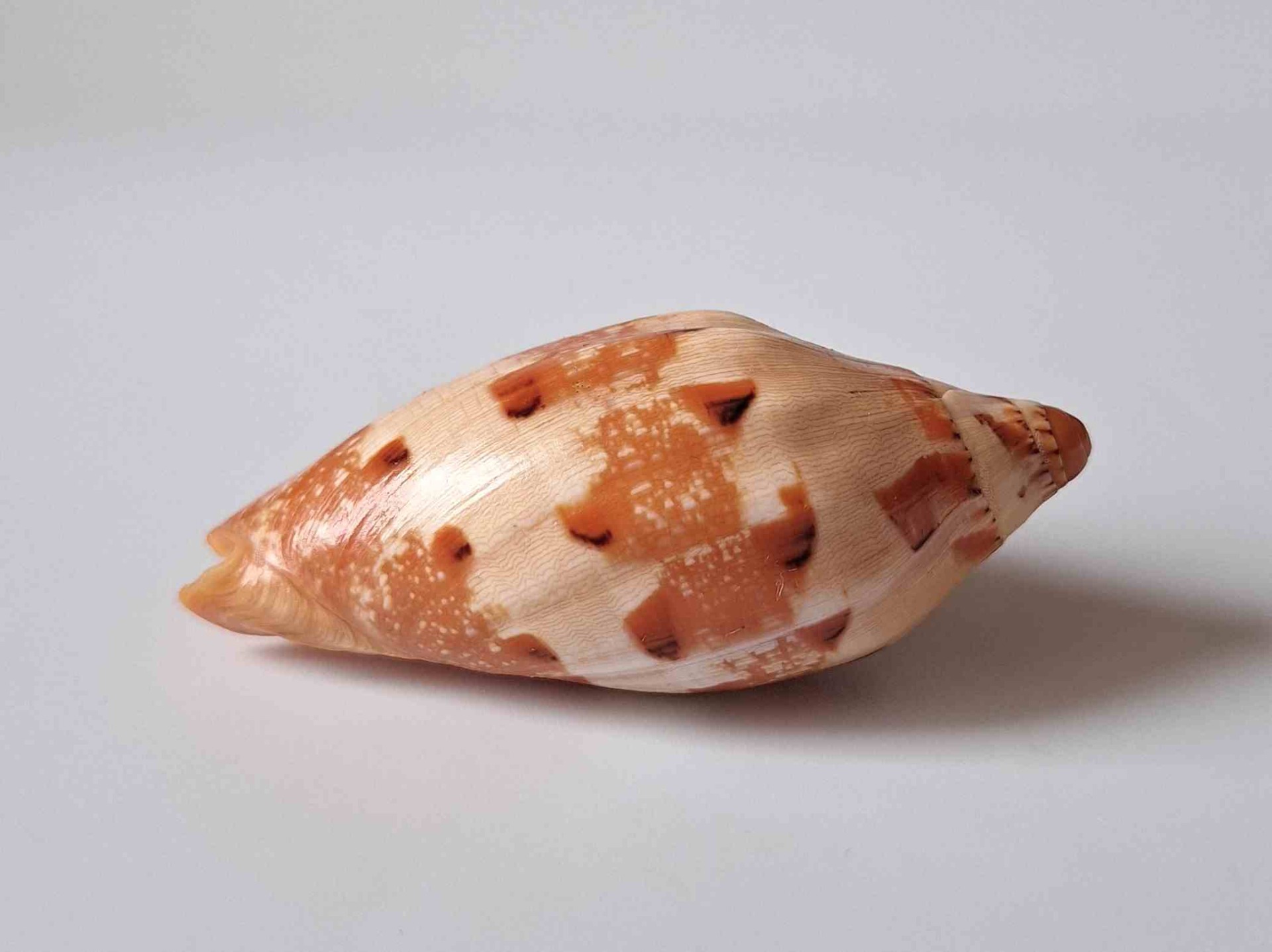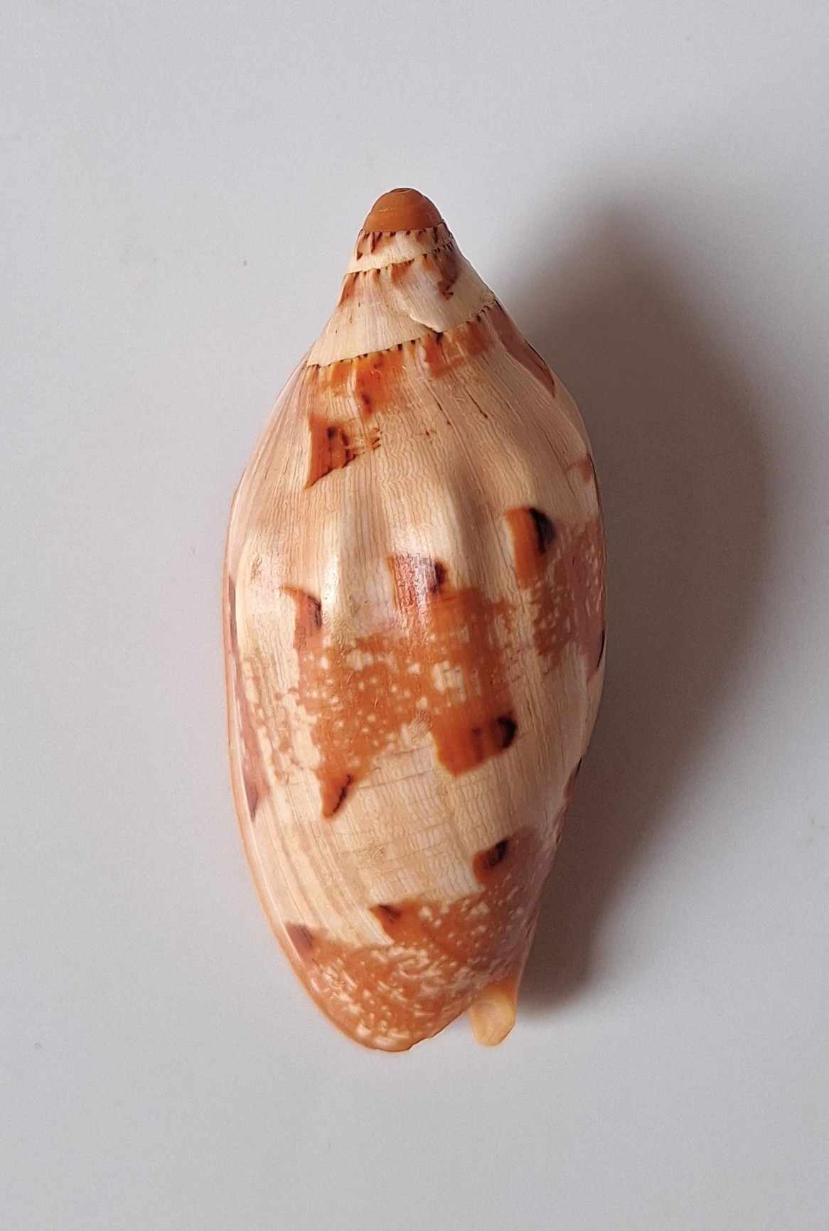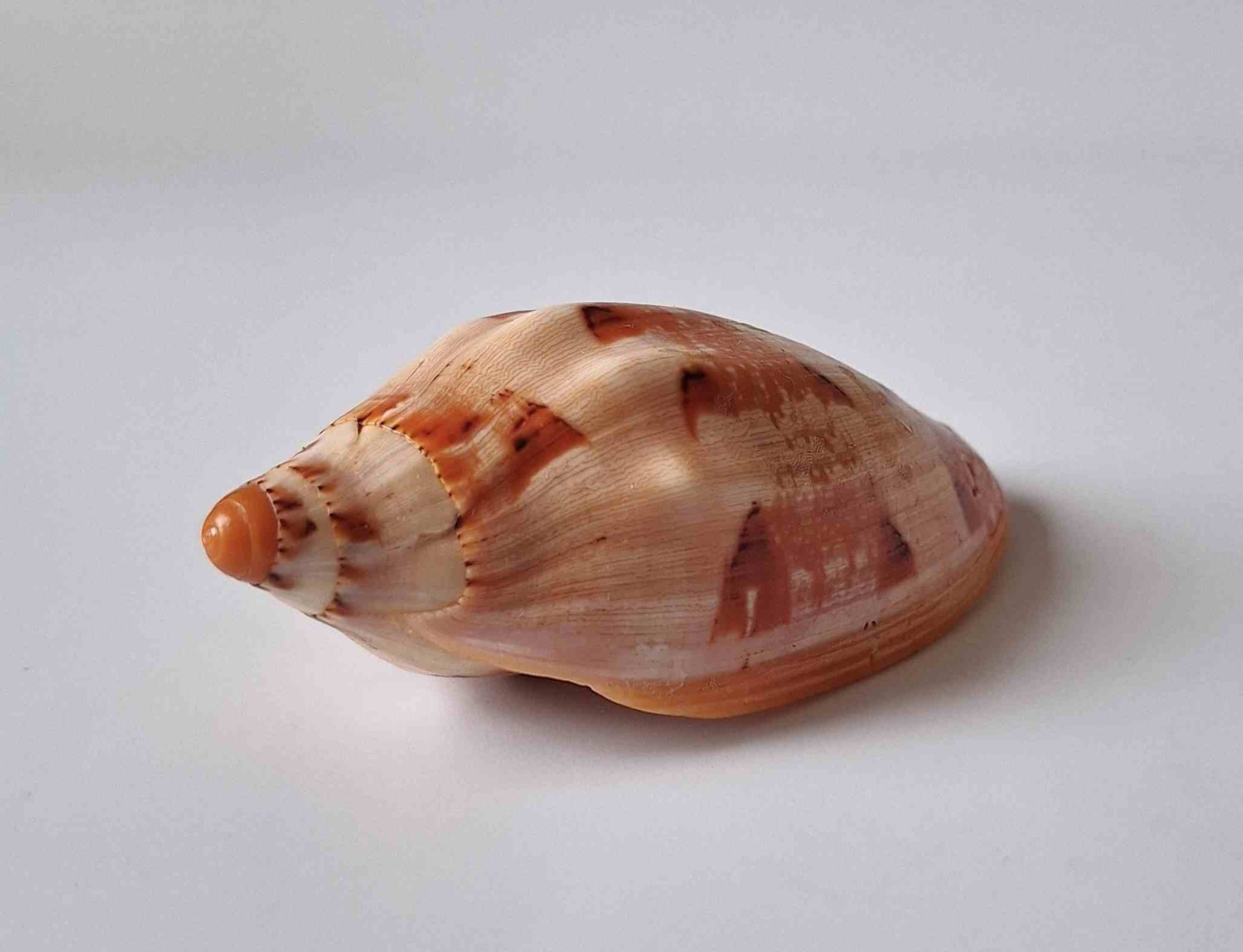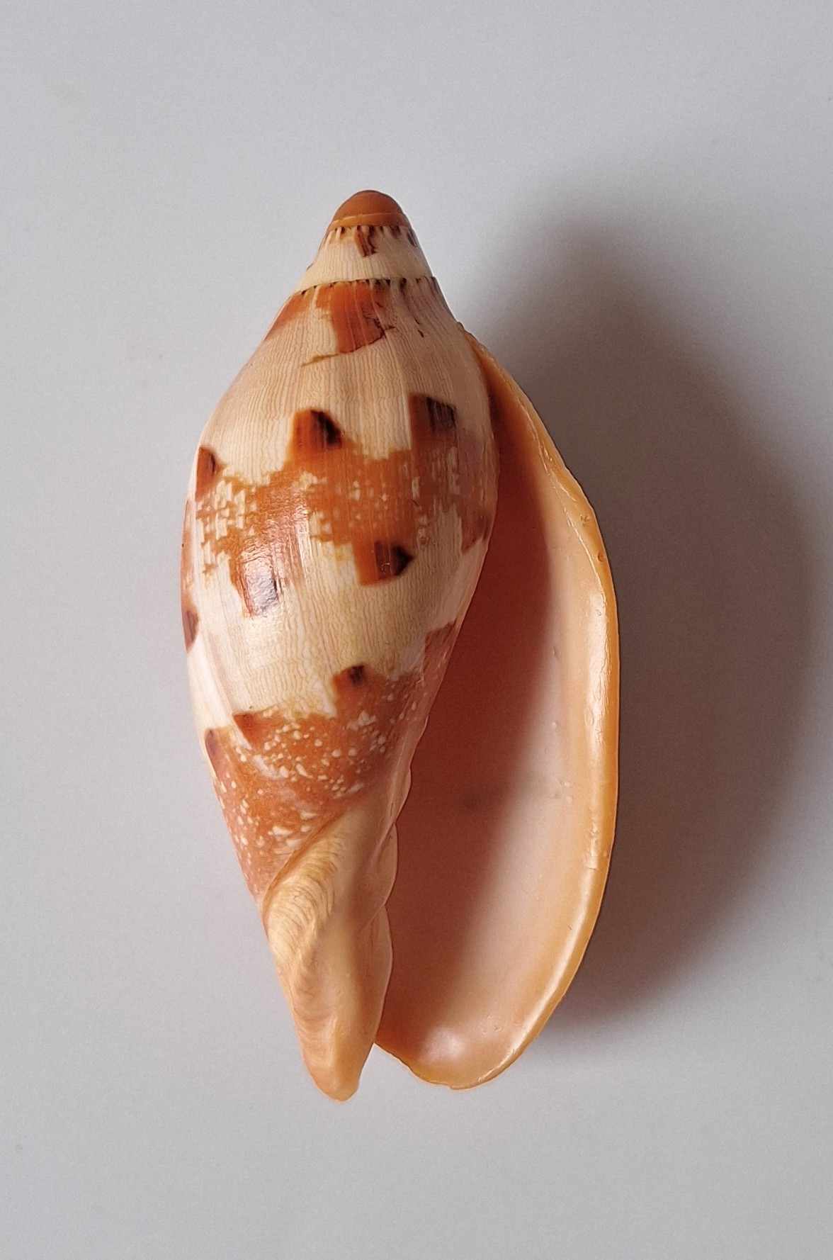 • moc hezký exemplář vzácného druhu, těžko se získává v dnešní době, hezká oranžová barva, nádherný vzor, zhojená jizva v blízkosti špičky, část okraje zabroušen, z hloubky 12 metrů (very nice specimen of rare specie, very hard to get nowdays, nice orange color, very nice pattern, healed scar near apex, partially lip abrazed, live taken from 12 m)