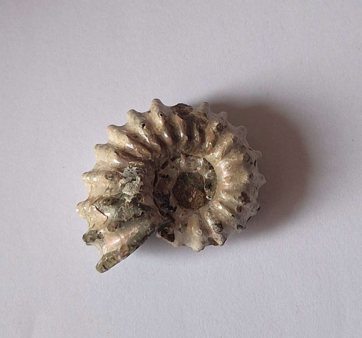 - zkamenělina amonita s perleťovým odleskem (ammonite fossil with a pearlescent reflection)