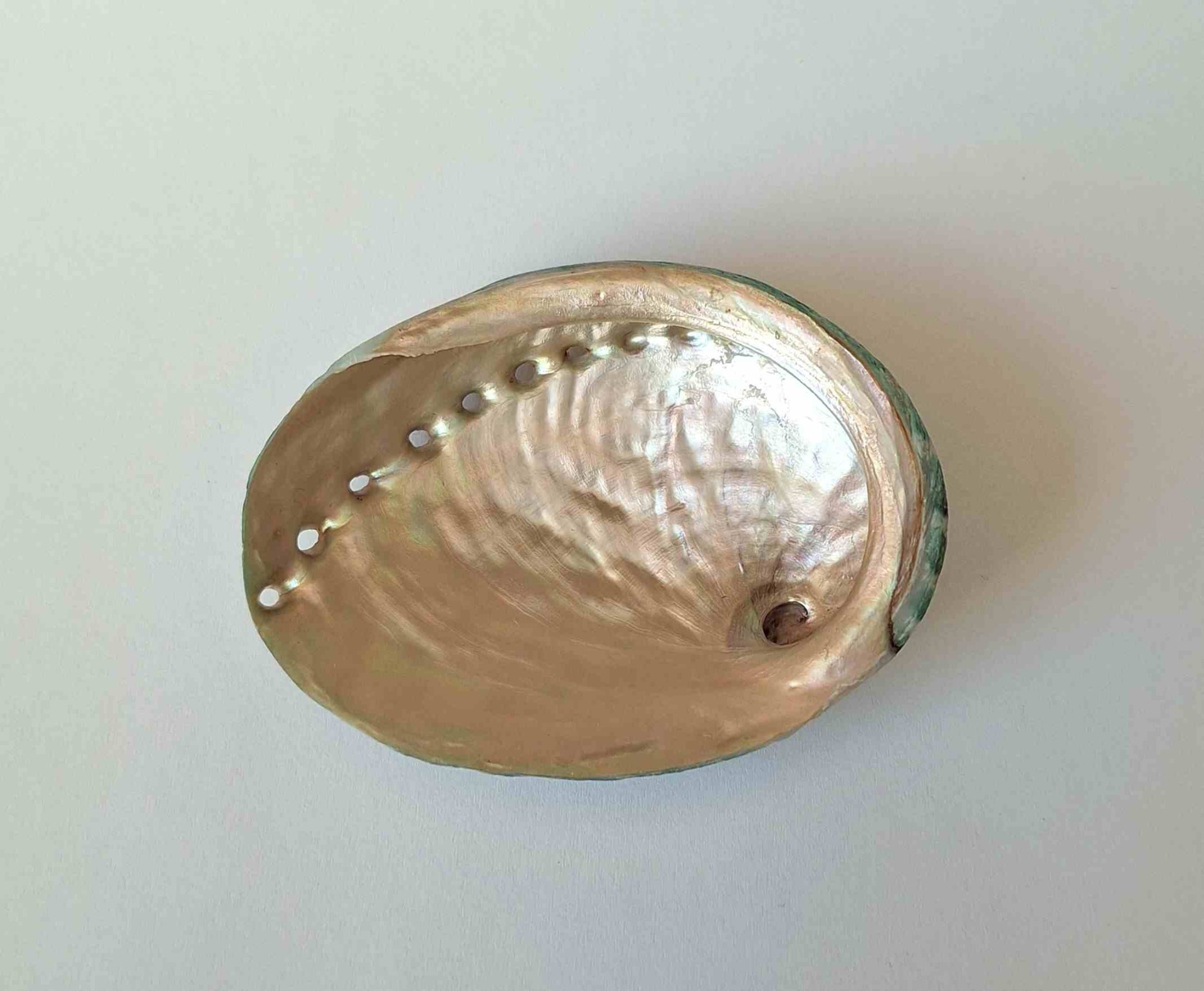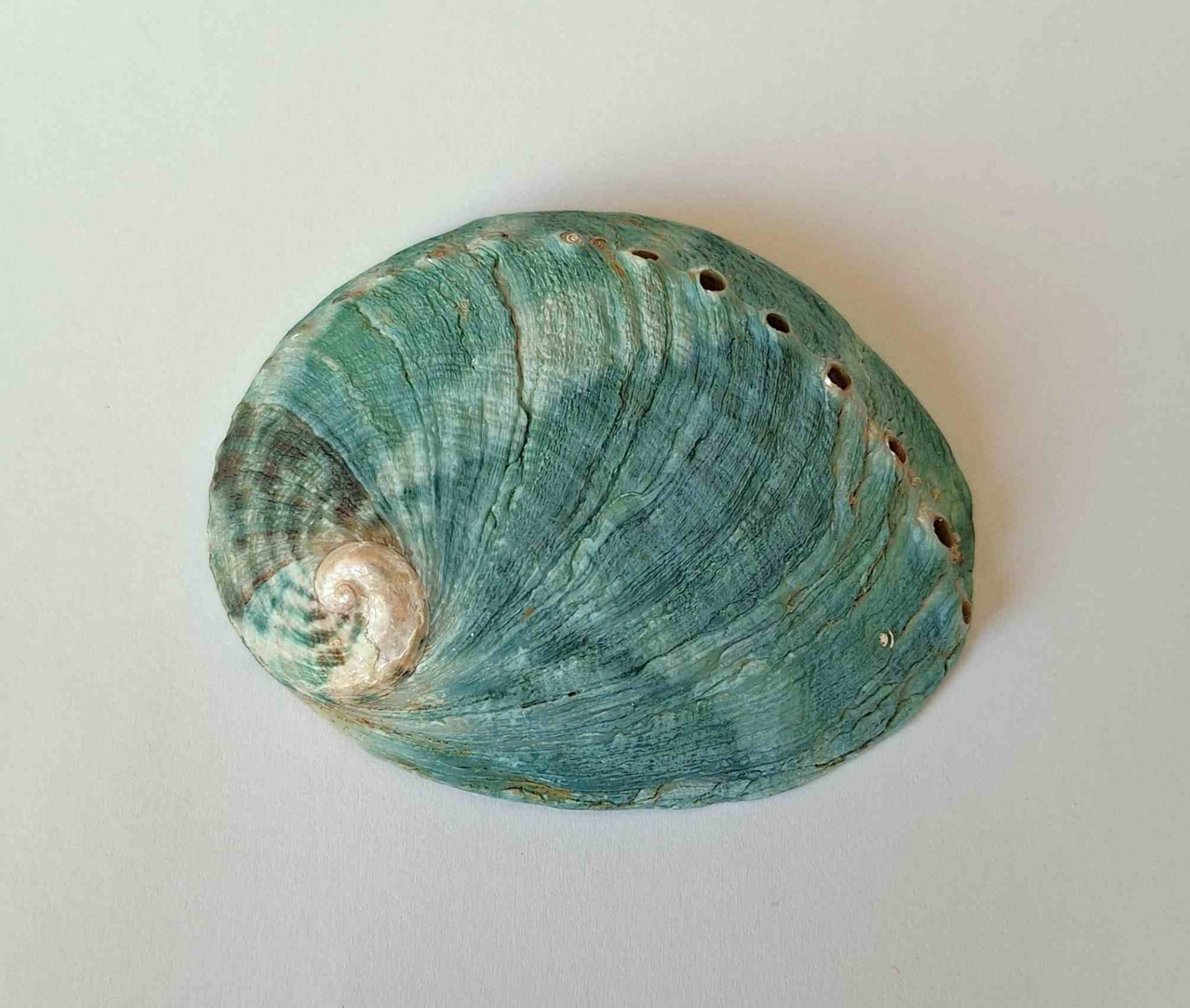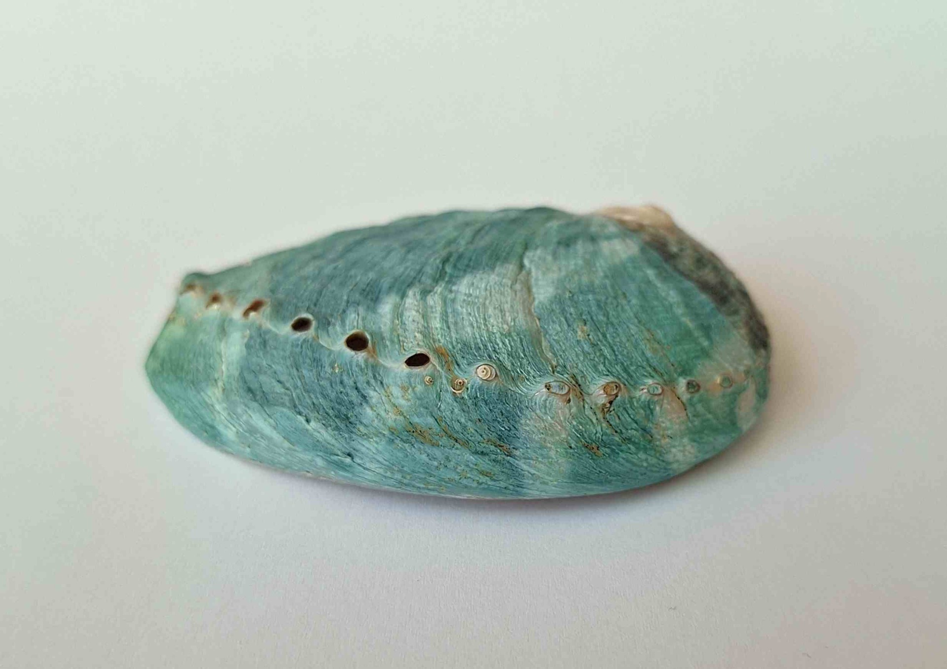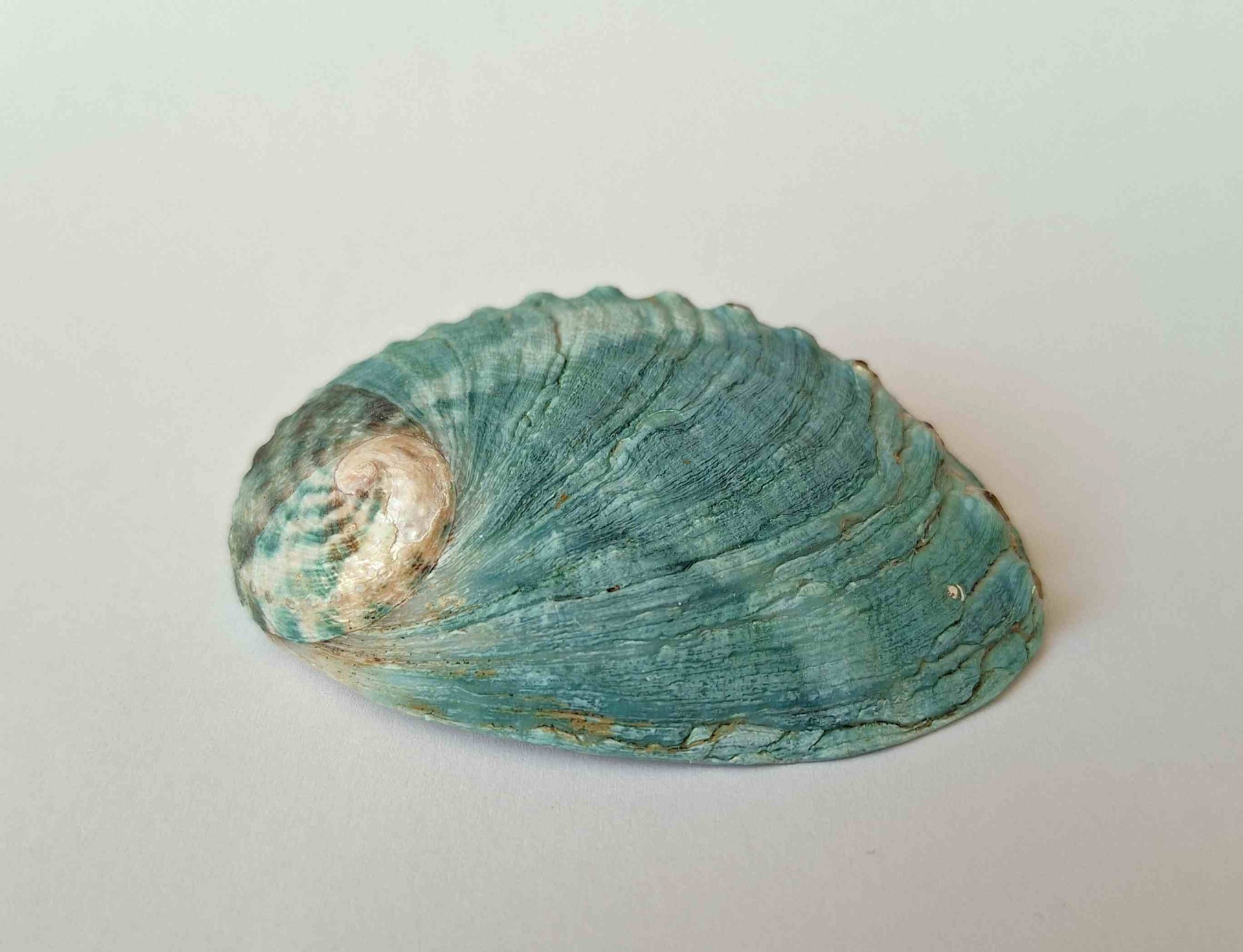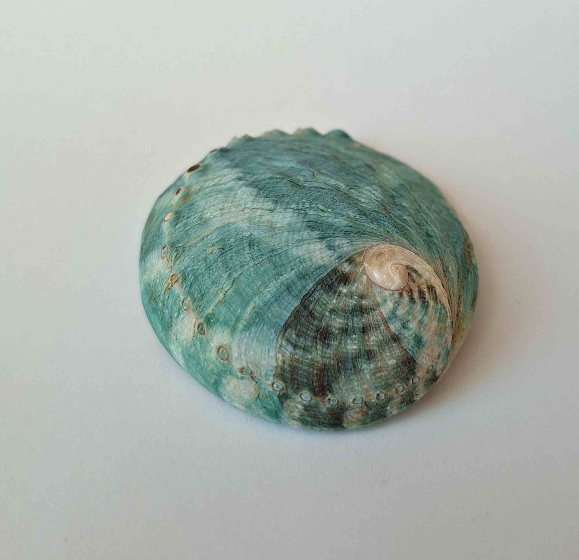 • hezký exemplář, krásná zelená barva, těžko se zachycuje skutečný odstín, uvnitř perleťová, okraj lehce zabroušený, drobné nedokonalosti (nice specimen, green color (hard to capture the real shade), pearlescent inside, lip lightly abrazed, minor imperfections)