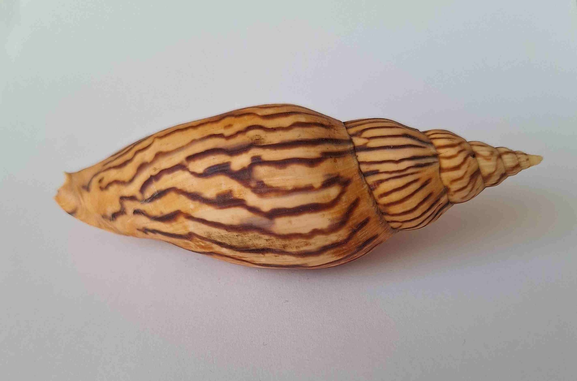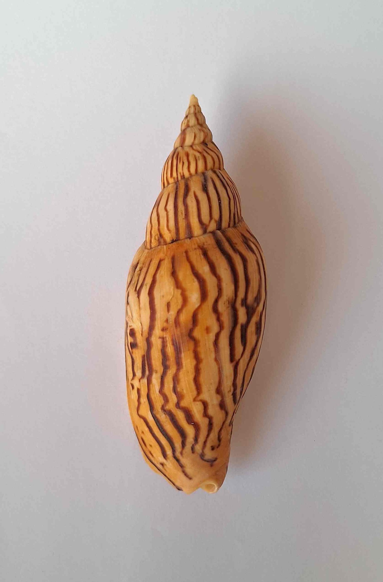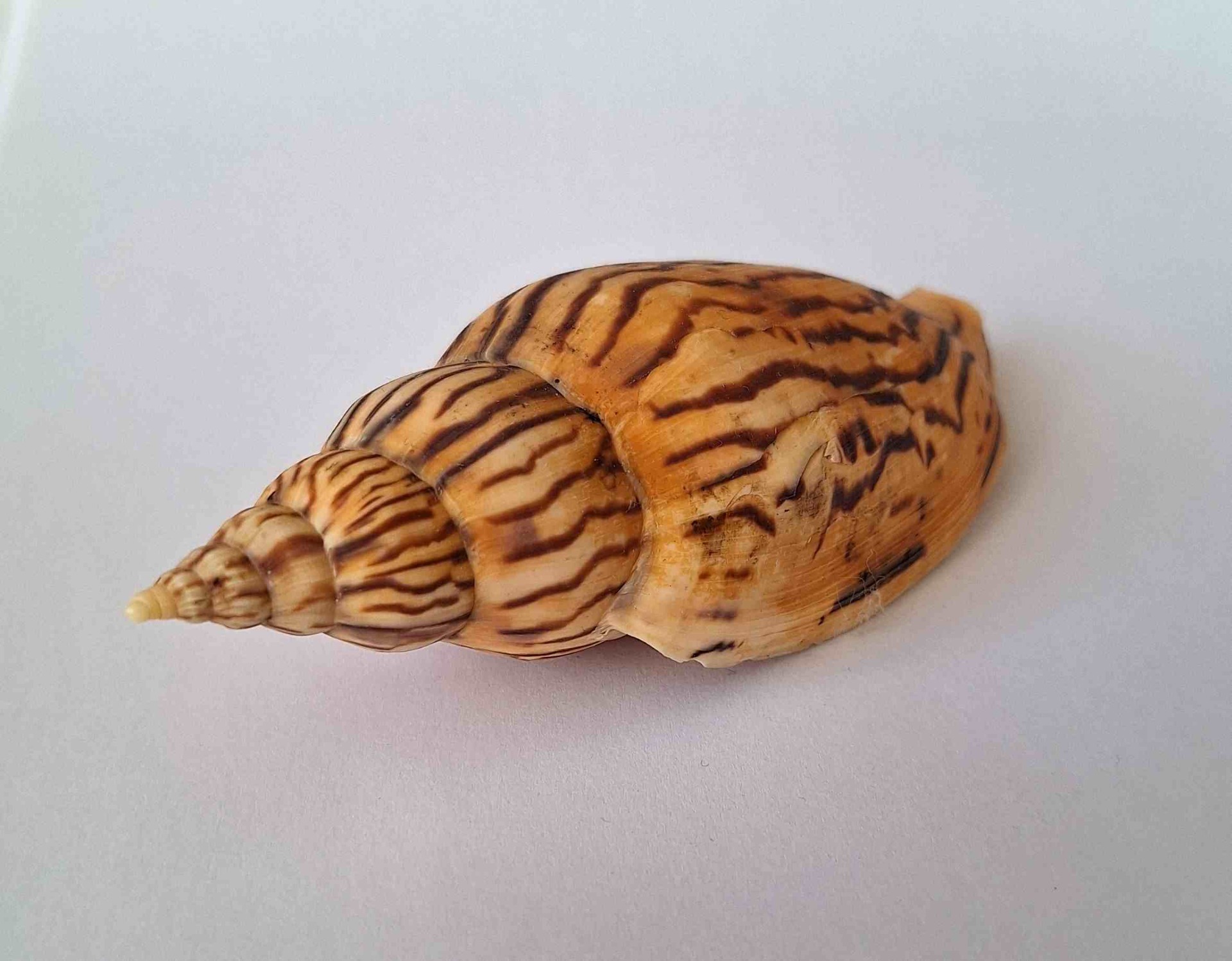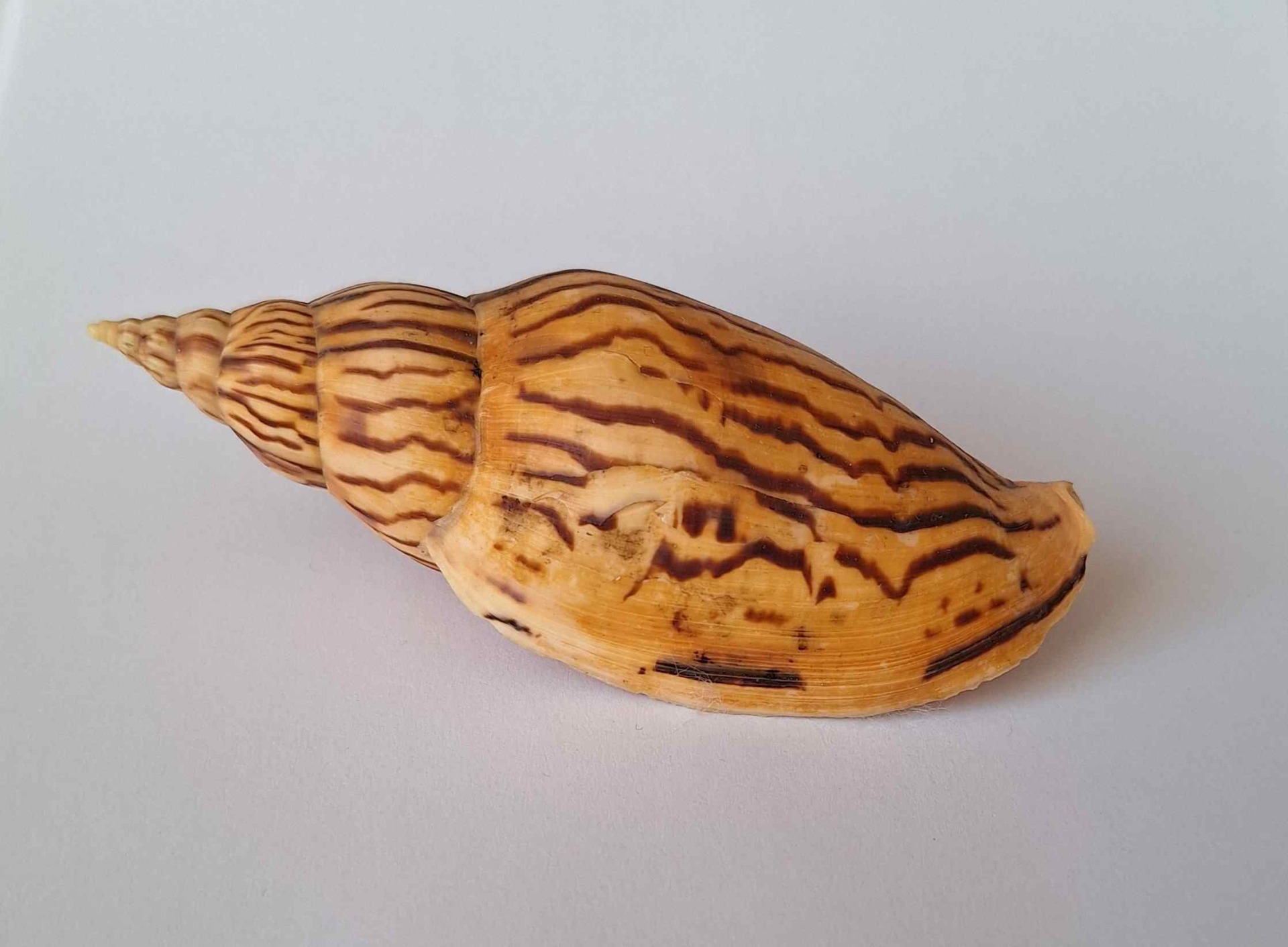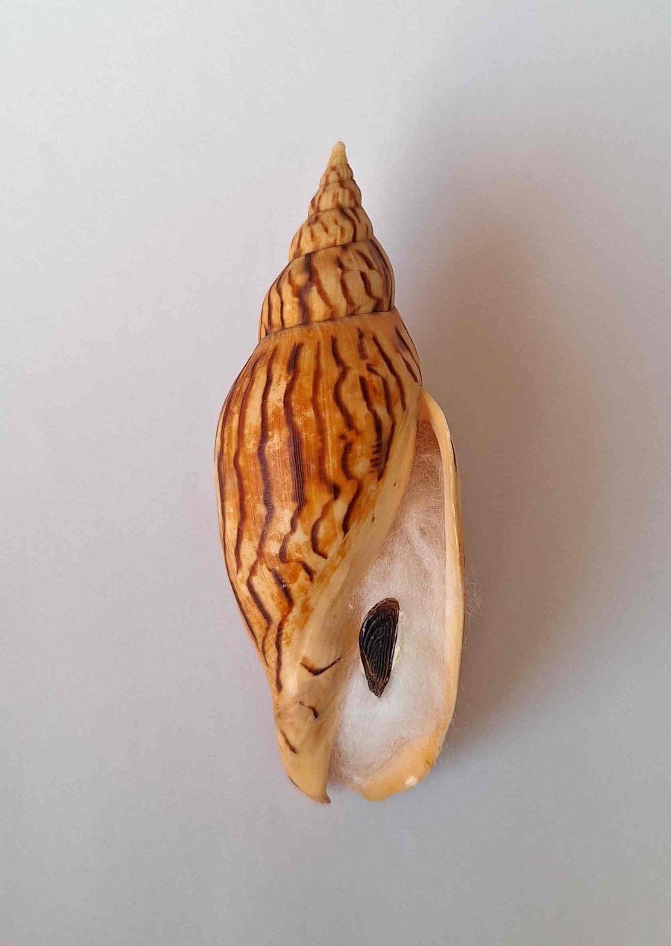 • velký vzorovaný exemplář s víčkem, hezká barva, jedno poškození na boku, okraj lehce štípnutý, z hloubky 100 metrů (big patterned specimen with operculum, nice color, one damage on the side, minor chip on lip, from depth of 100 meters)