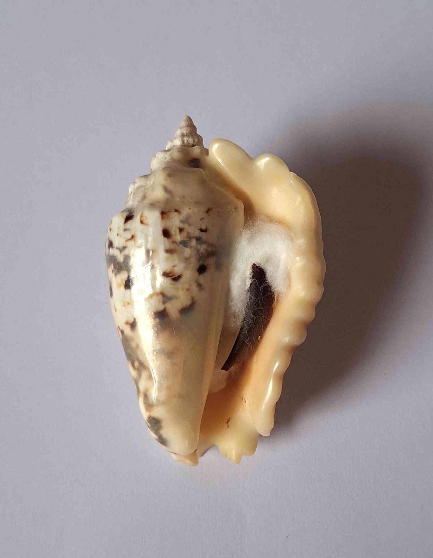 • hezký exemplář s víčkem, světlá barva, vyloven v hloubce 5 metrů (nice specimen with operculum, light color, taken by local fishermann by diving at a depth of 5 meters)