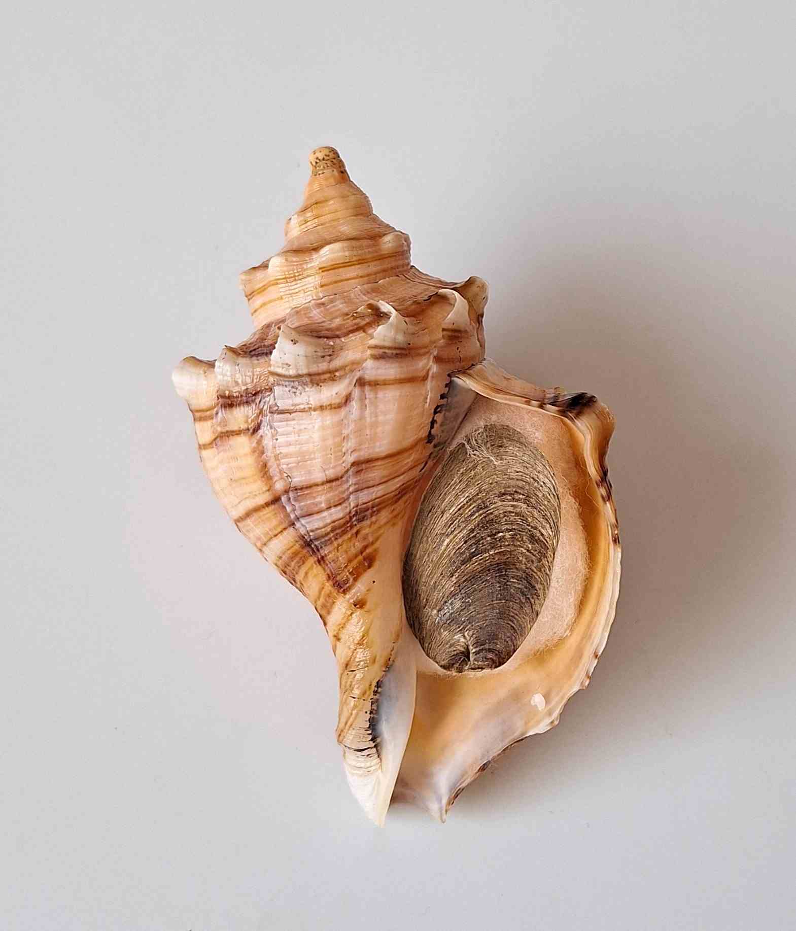 • hezký exemplář s víčkem, krásná světle hnědá barva, štípnutí na okraji, z hloubky 20 metrů na písečném dně (nice specimen with operculum, beautiful light brown color, chip on lip, from 20 meters depth, sandy bottom)