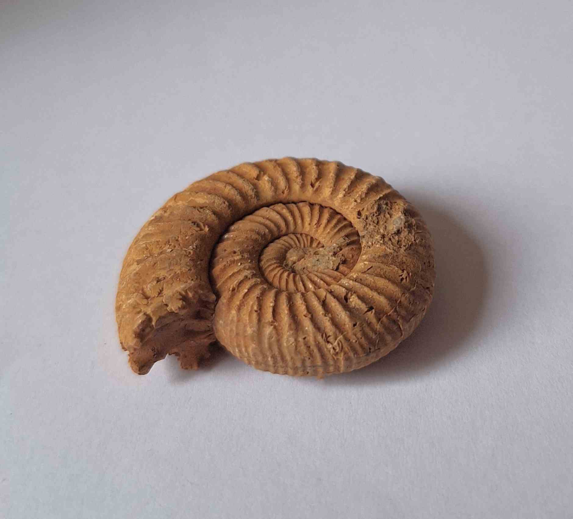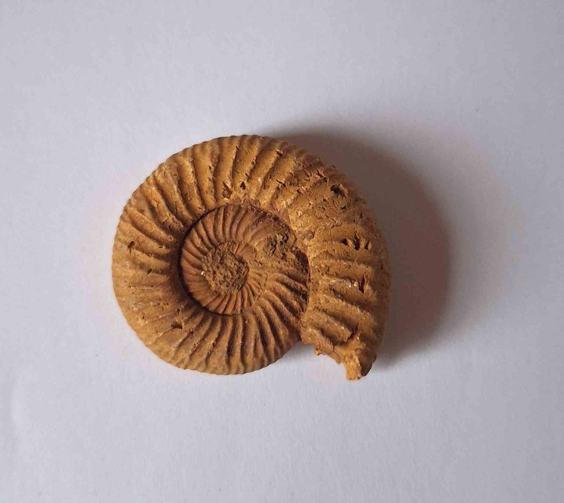 - amonit se zachovalým původním středem, trojrozměrný, pokrytý hnědým pískovcem (ammonite with preserved original center, three-dimensional, covered with brown sandstone)
