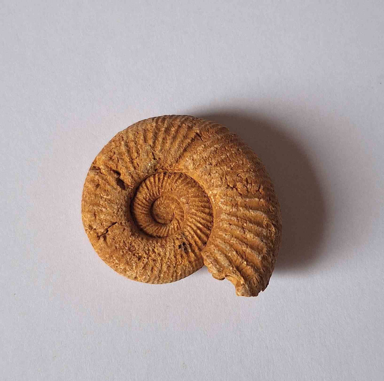 - amonit se zachovalým původním středem, trojrozměrný, pokrytý hnědým pískovcem (ammonite with preserved original center, three-dimensional, covered with brown sandstone)