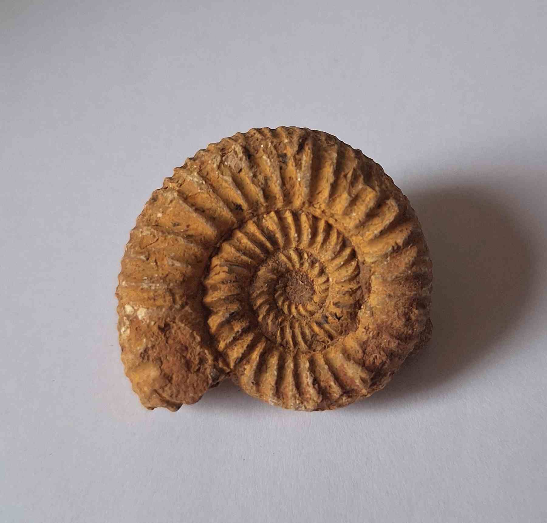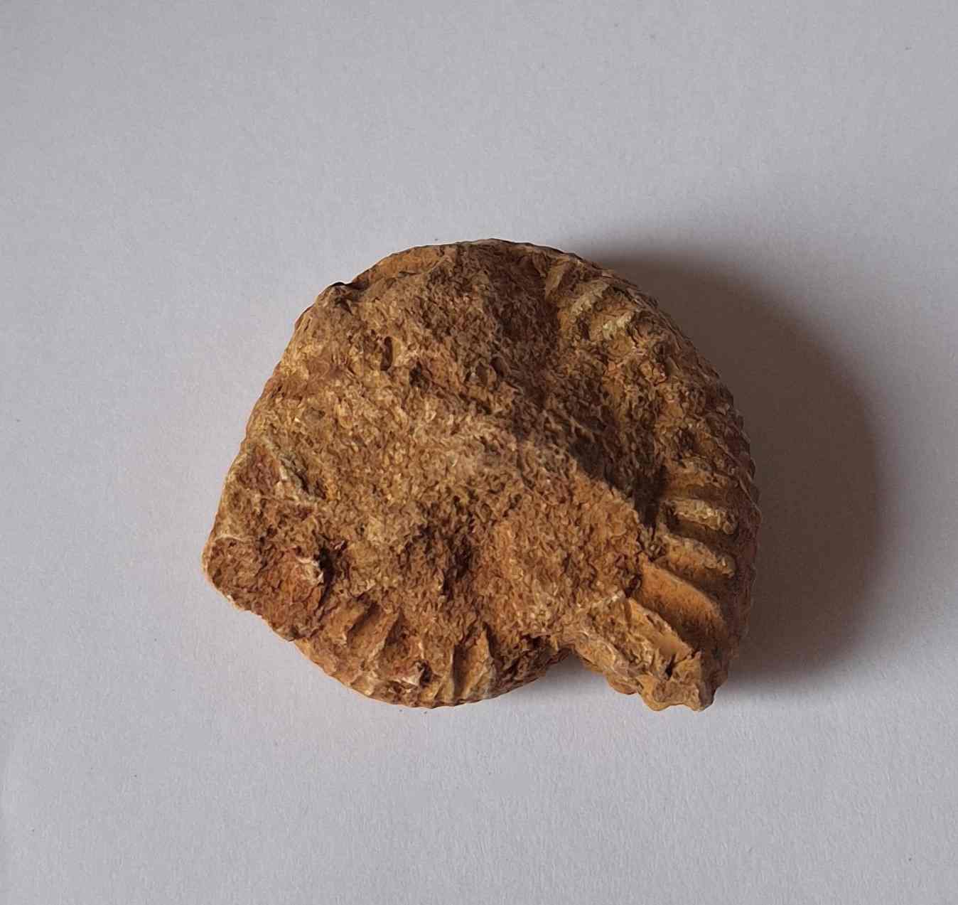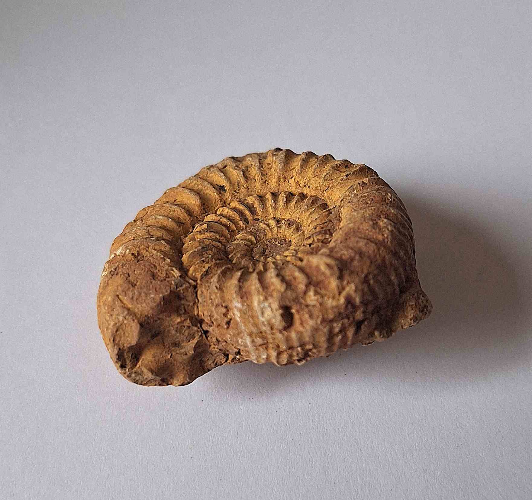 - amonit se zachovalým původním středem, trojrozměrný, pokrytý hnědým pískovcem (ammonite with preserved original center, three-dimensional, covered with brown sandstone)