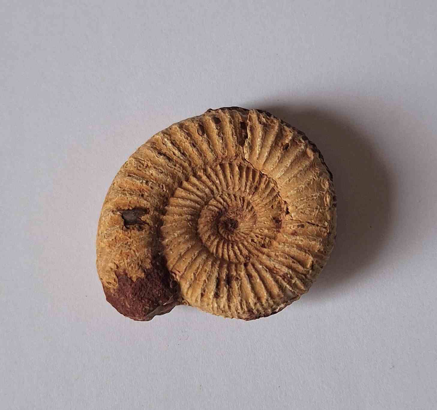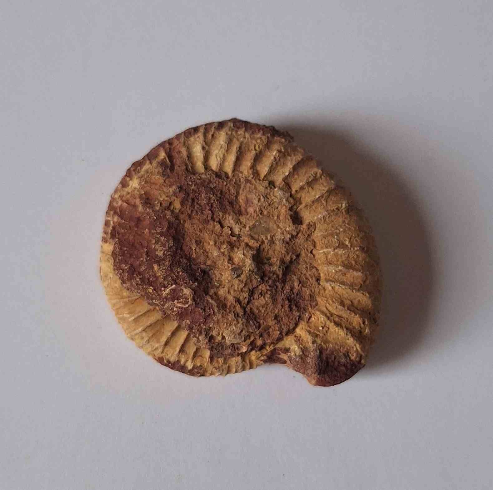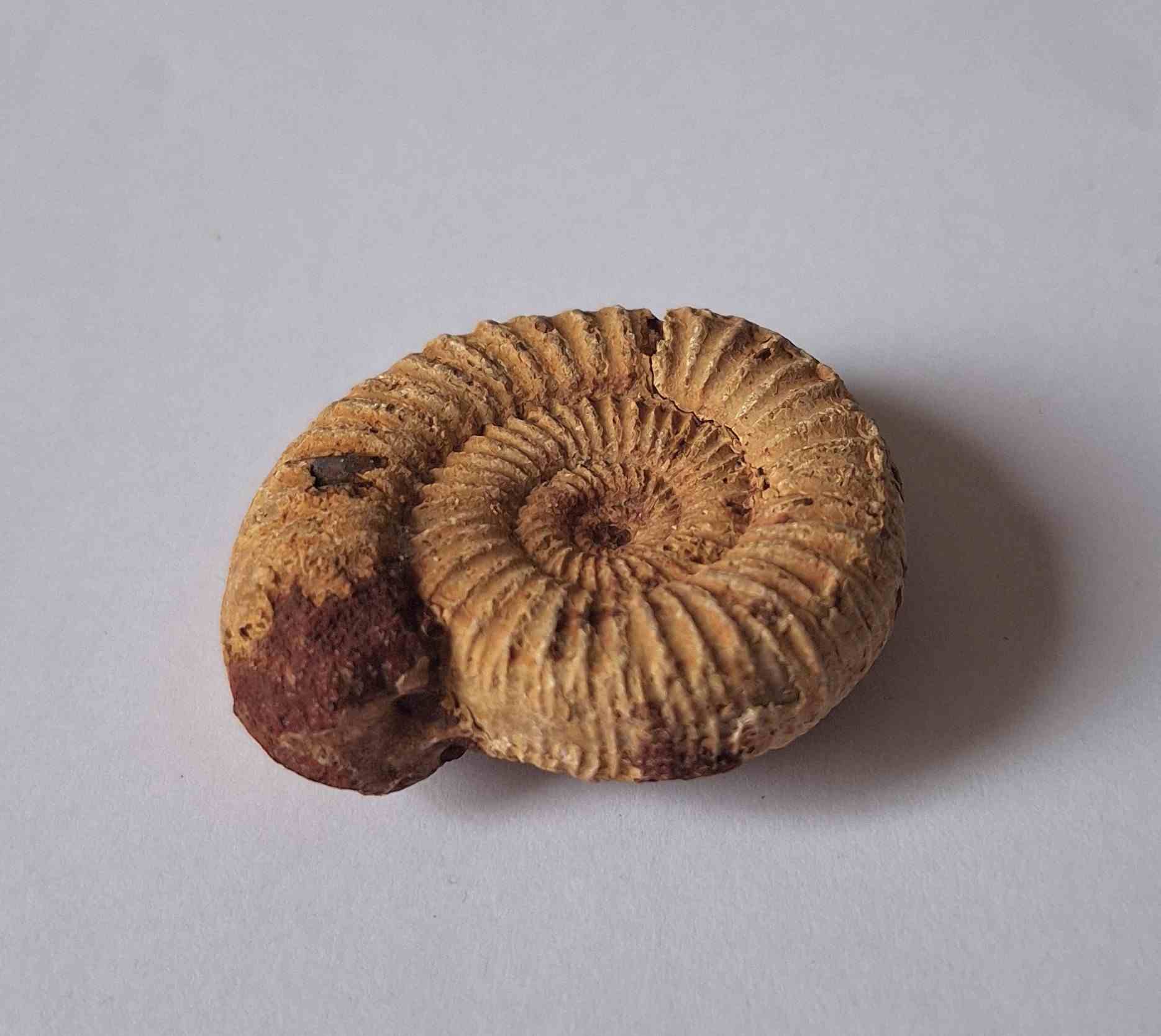 - amonit se zachovalým původním středem, trojrozměrný, pokrytý hnědým pískovcem (ammonite with preserved original center, three-dimensional, covered with brown sandstone)