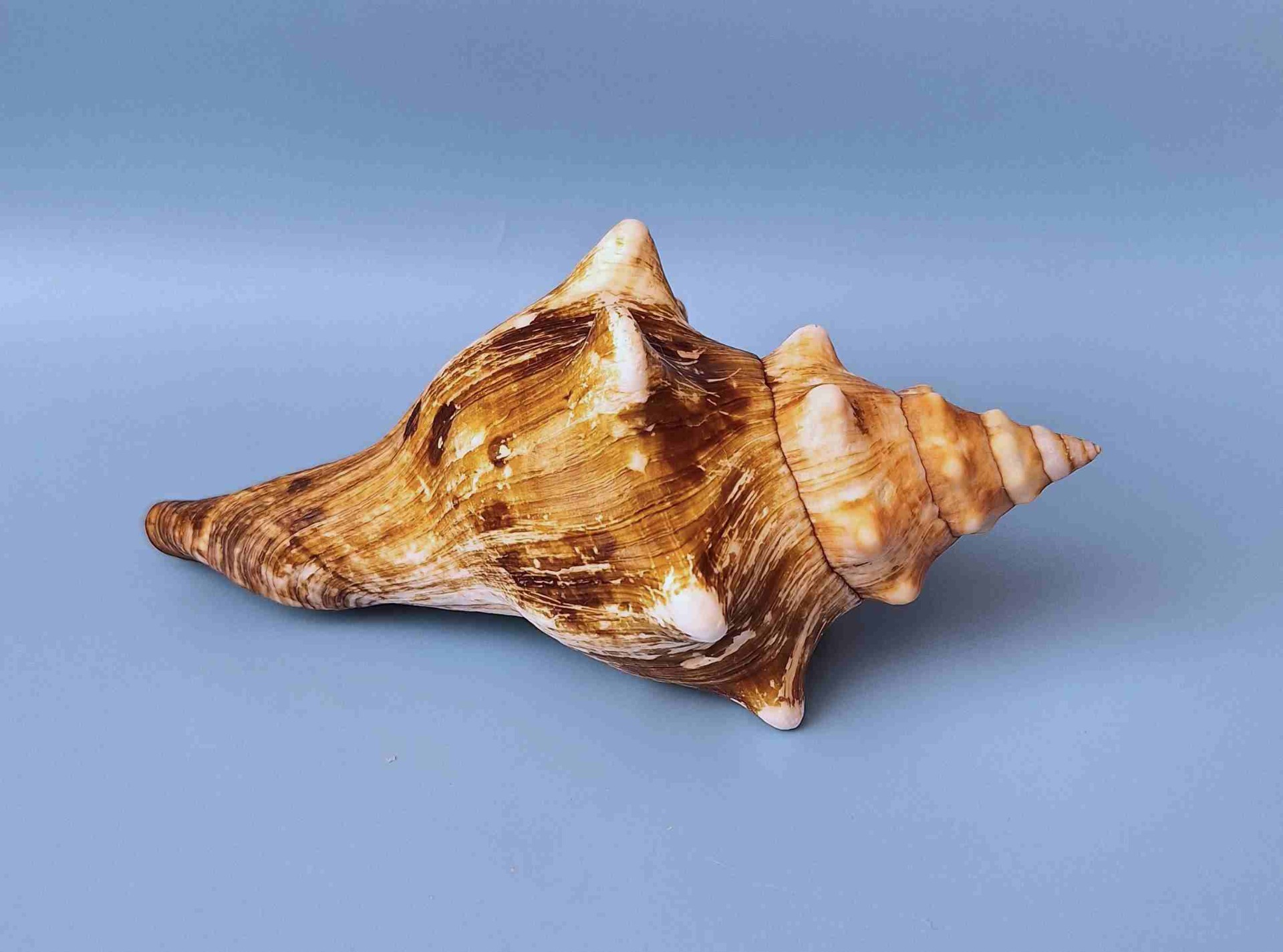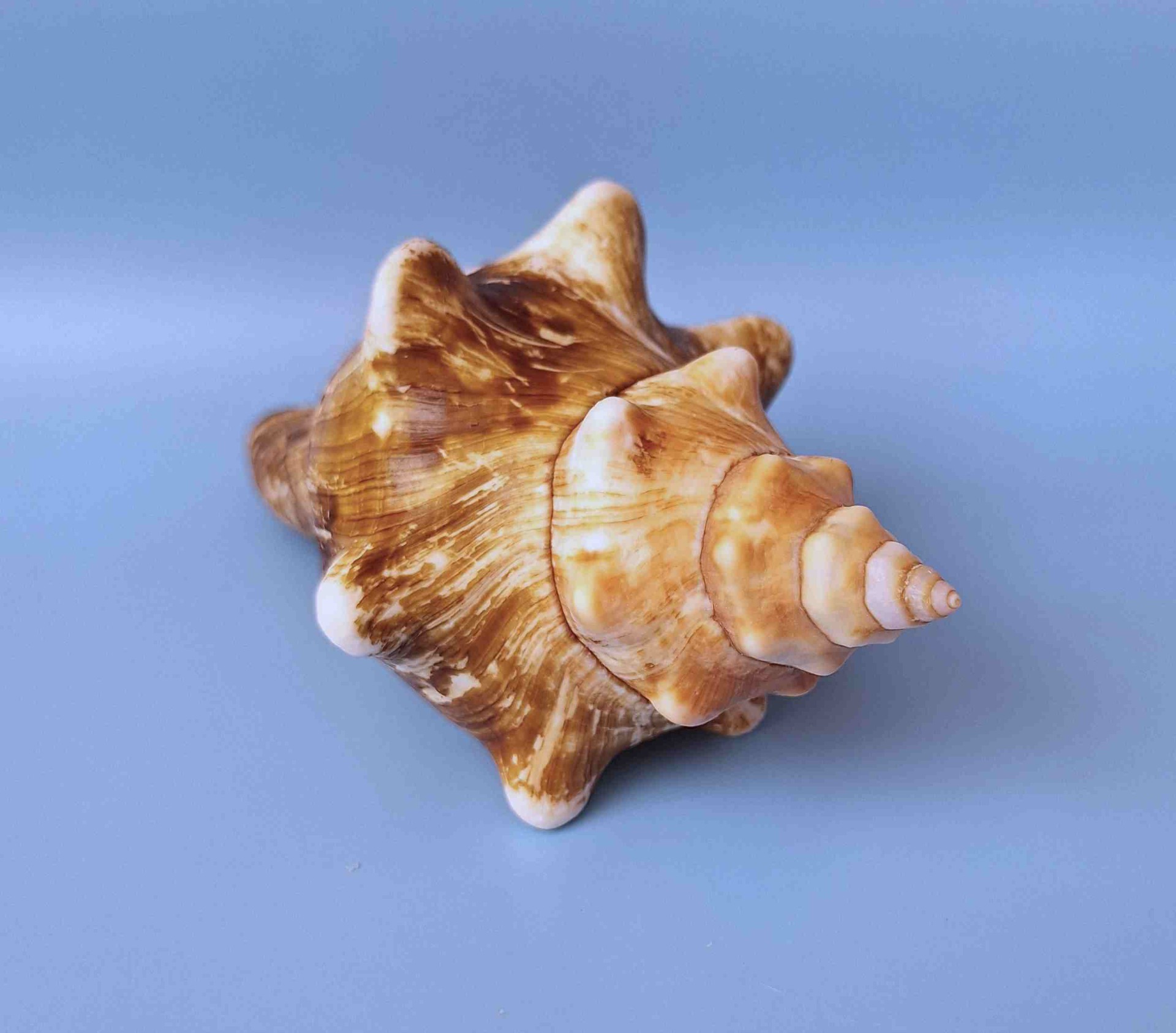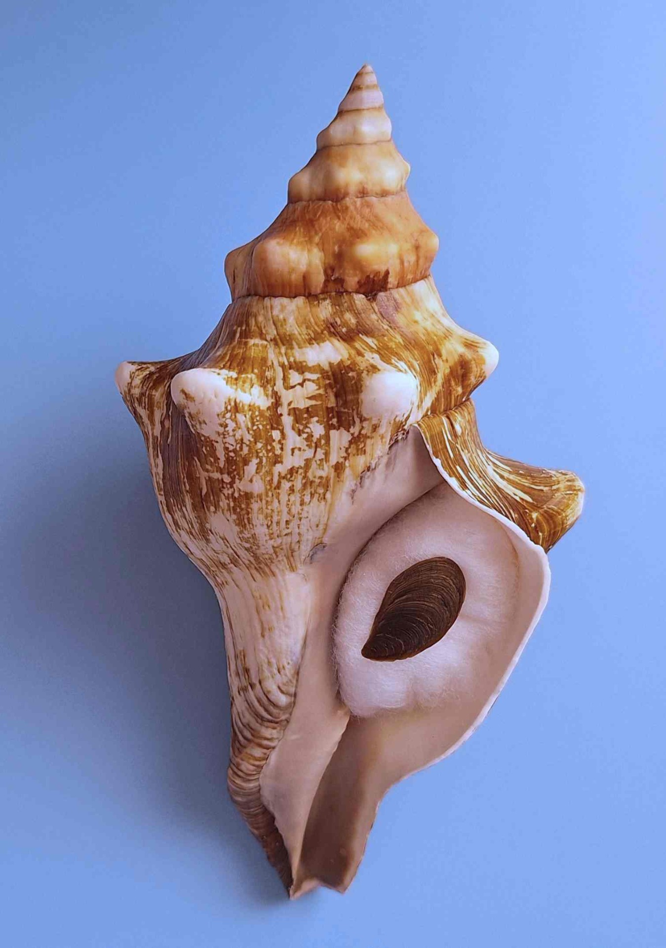 • velmi hezký těžký exemplář s víčkem, žádné příčné pruhy, dobrá kvalita na tento masivní kus, dvě malé dírky, okraj štípnutý (very nice heavy specimen with operculum, no transversal stripes, good quality for this massive shell, 2 small drillholes as usual, lip chipped)
