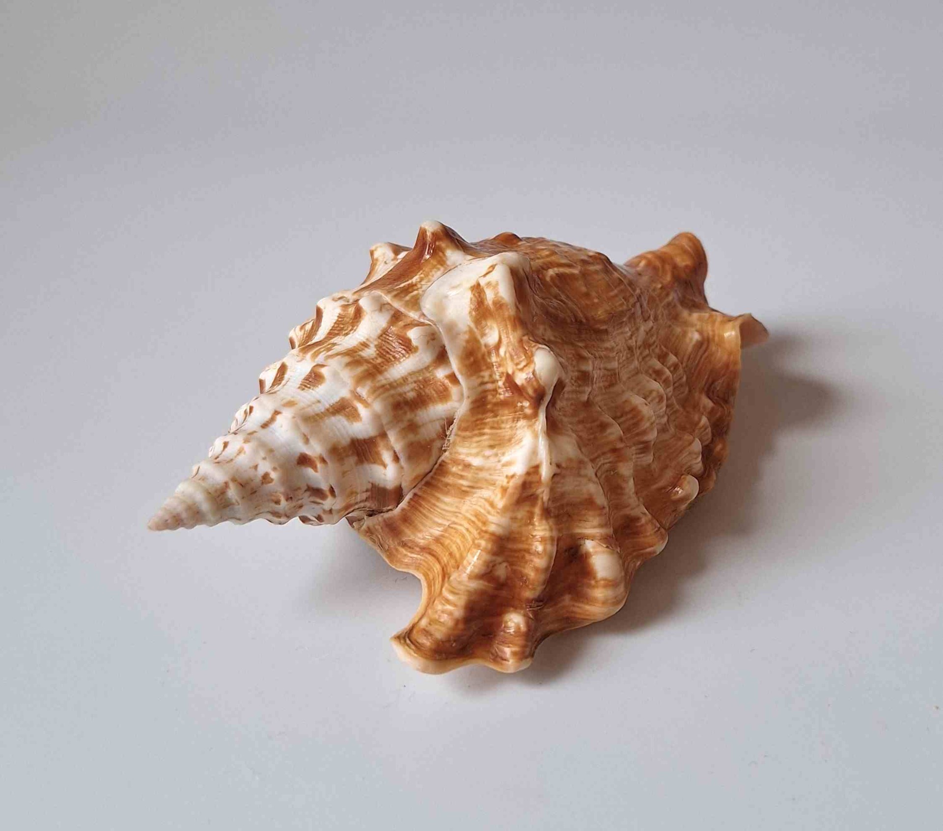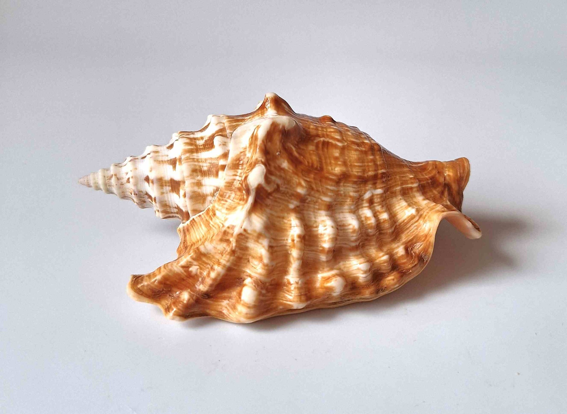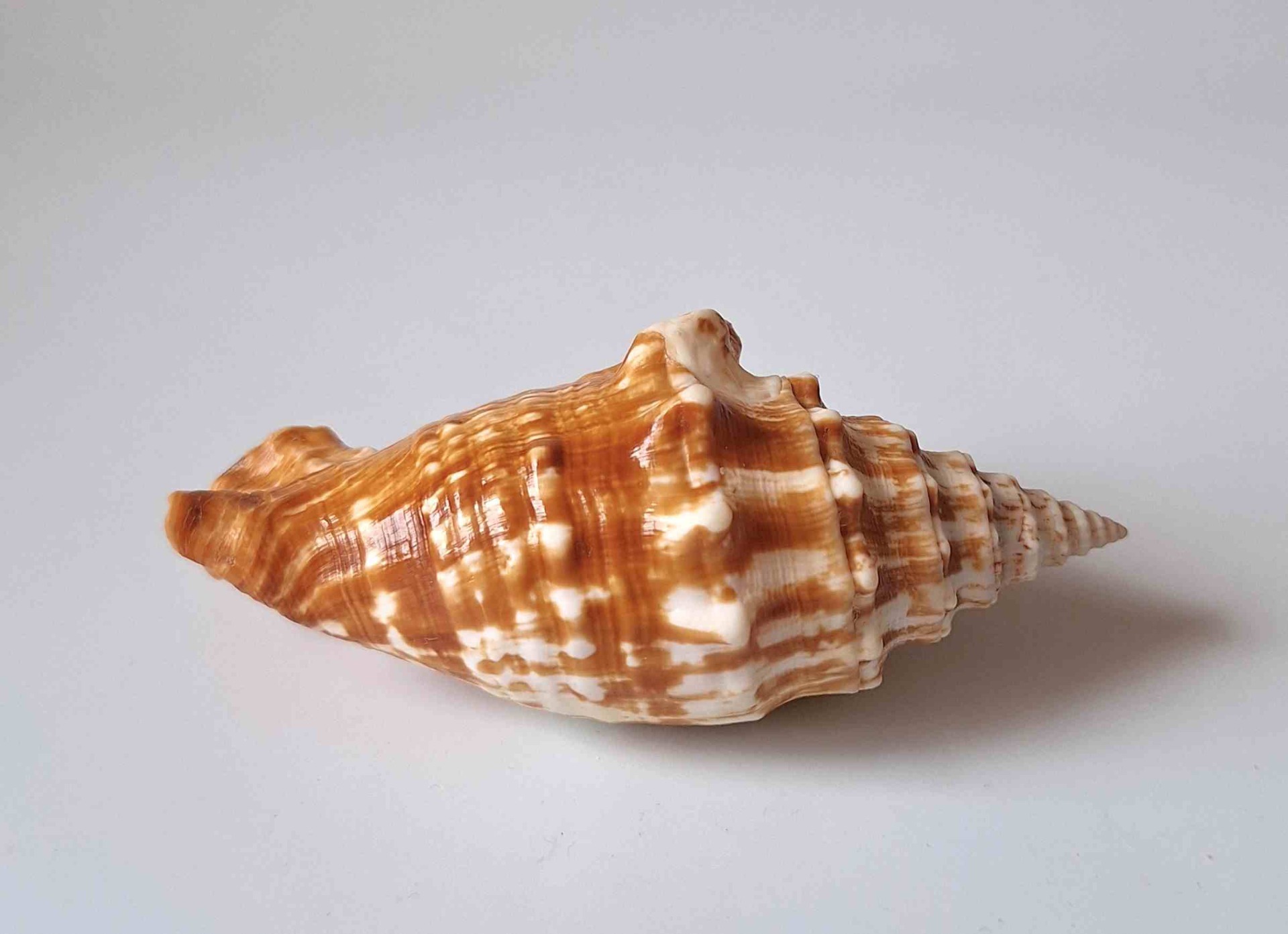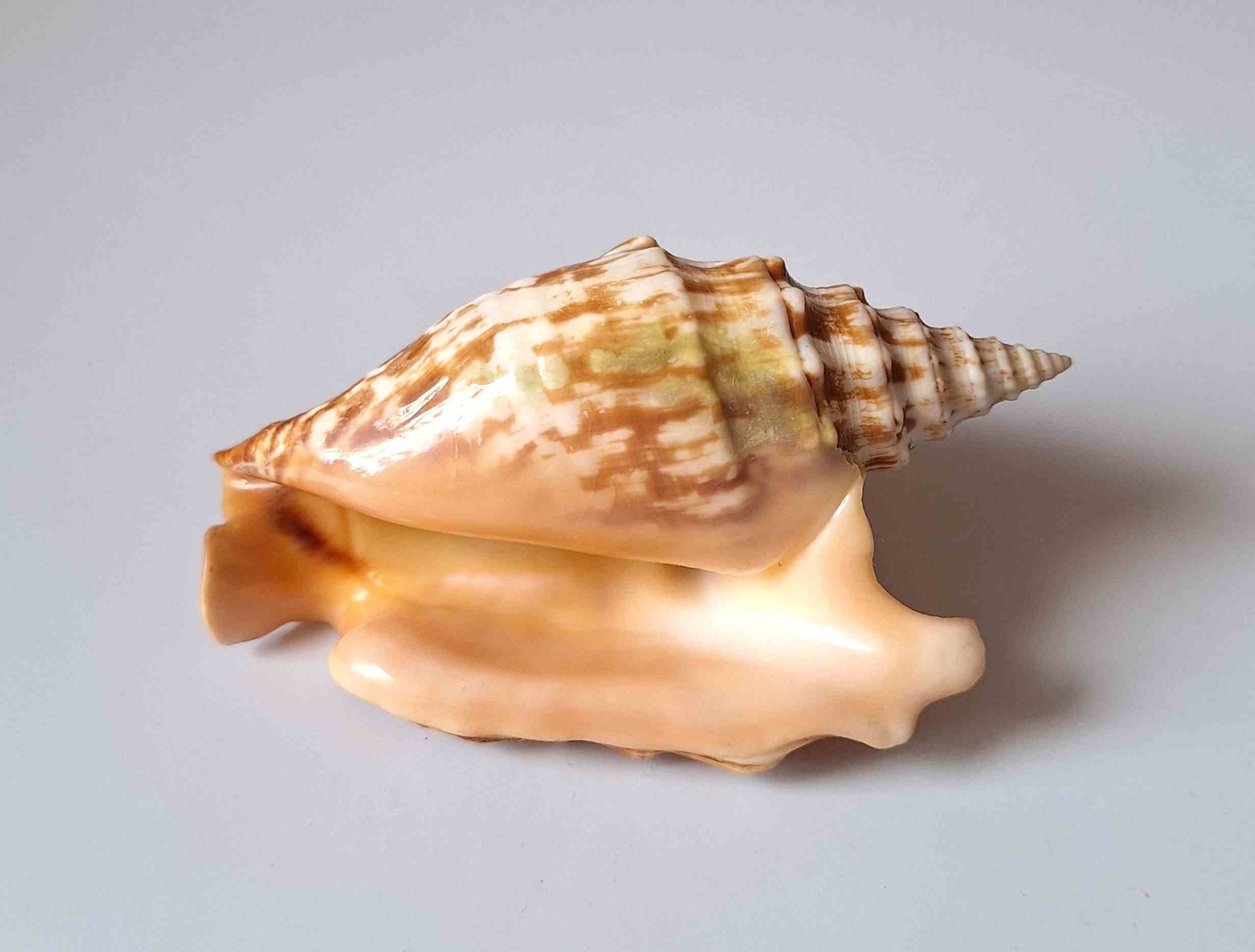 • nádherný exemplář, krásná barva a vzor, krásný okraj, drobné štípnutí na jednom hrotu  a okraji v blízkosti spirály, na spodní straně lehce nazelenalý (beautiful specimen, beautiful color and pattern, very nice lip, minor chip on one thorn and lip near the spiral, lightly greenish on base)